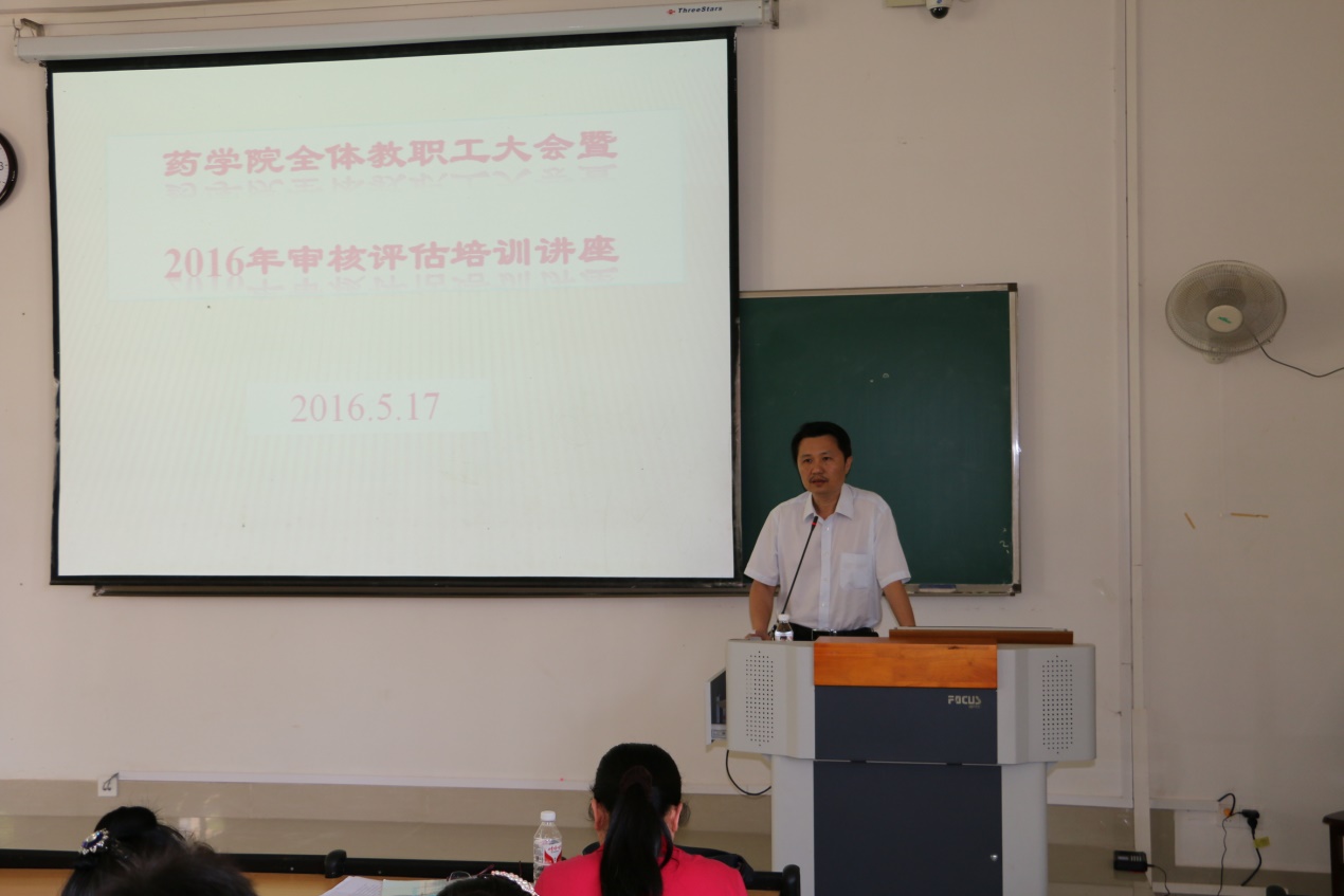 为了更好的推进本科教学审核评估工作,5月17日下午,药学院在仙葫校区教学楼召开了本科教学工作审核评估再部署、再动员工作会。庞宇舟副校长莅临会议指导工作,药学院全体教职工参加了会议,会议由药学院陈勇院长主持。