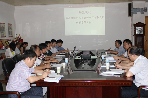 2016年5月26日下午,学校党委常委、总会计师何刚亮率学校财务处处长黄秀娥、校办副主任李朝晖、财务处副处长赵斌等同志莅临制药厂调研指导工作,制药厂领导班子全体成员参加调研会议。