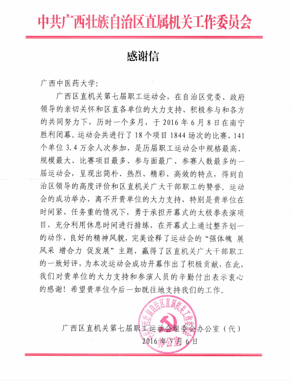 日前,中共广西壮族自治区直属机关工作委员会在给beat365官网的感谢信中盛赞beat365官网太极拳表演队,认为beat365官网在区直机关第七届职工运动会开幕式上表演的太极拳通过整齐划一的动作、良好的精神风貌,完美诠释了运动会“强体质、展风采、增合力、促发展”的主题,赢得了区直机关广大干部职工的赞誉。