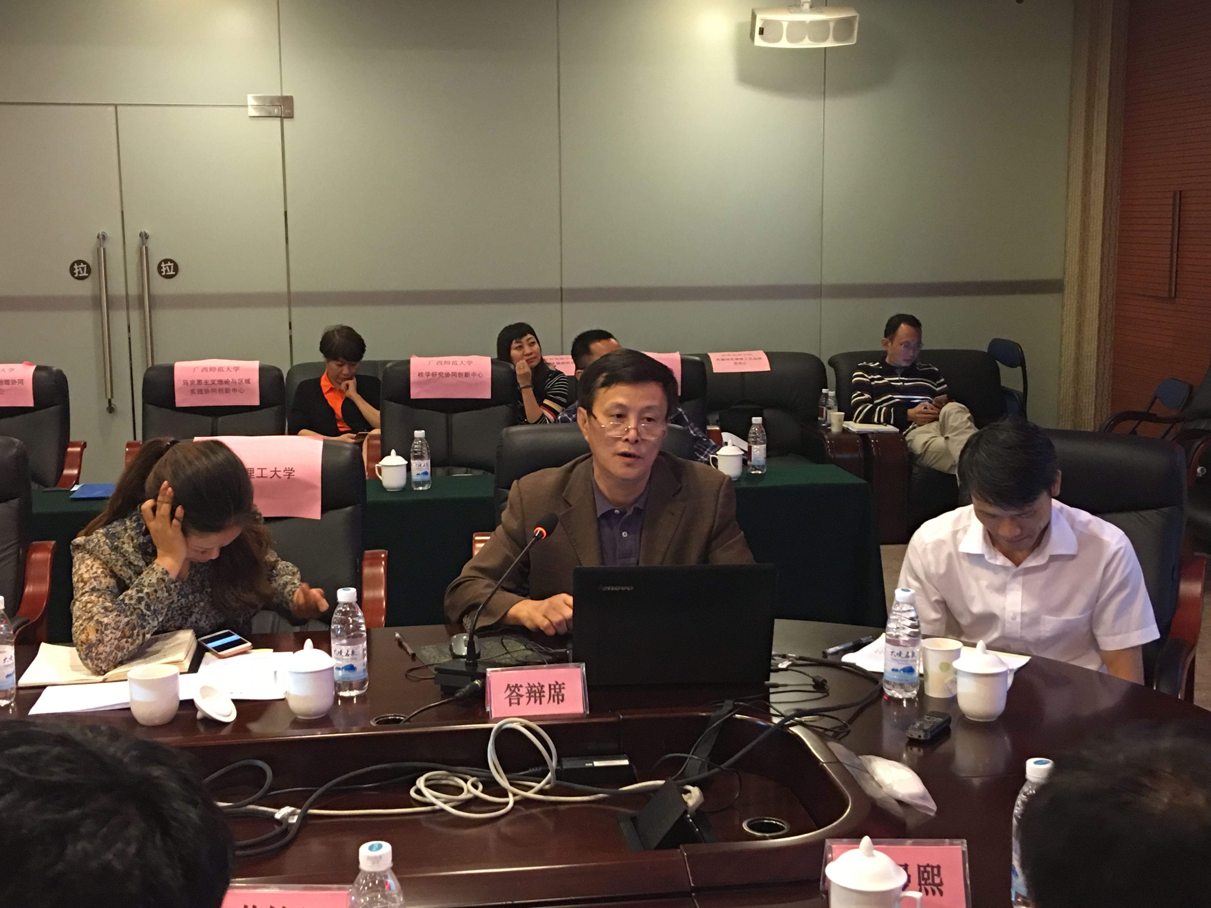 本次会议由广西师范大学社会科学研究处处长、广西人文社会科学发展研究中心主任林春逸主持,专家组由华中师范大学人文社会科学高等研究院副院长石挺研究员,南宁学院副院长陈雄章,南京大学社科处处长、南京大学博士生导师王月清教授,广西大学社会科学处处长、中国—东盟研究院常务副院长范祚军教授,社科处处长刘焕明教授,广西教育厅科学技术与信息化处处长傅源方博士,广西教育厅科学技术与信息化处干部黄漫熙等专家组成。