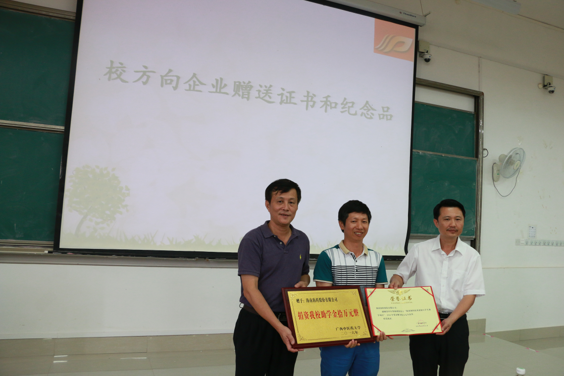 颁奖环节结束,董副书记、庞副校长分别向海南海药股份有限公司赠送捐资助学证书和纪念品。