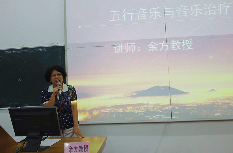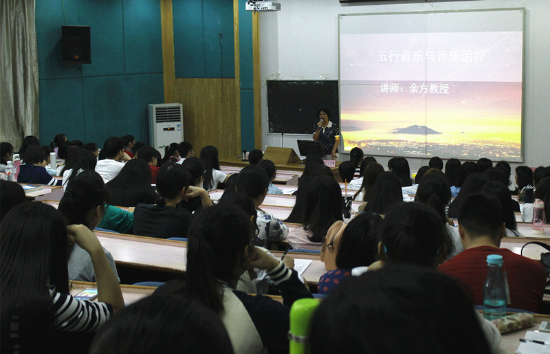 11月16日晚上,明秀校区西梯一教室座无虚席,由beat365官网老教授协会、老科技工作者协会理事余方教授主讲的《音乐治疗与五行音乐》讲座吸引了众多的听众。余方教授长期从事音乐治疗方面的研究工作,她从五音声、五音歌、五行音乐,音乐治疗的起源和发展、音乐治疗的现状,如何用音乐养生、治病、调理情绪、提高学习效率等方面给大家娓娓道来,大家时而随着老师唱五声歌,时而静静地聆听五行音乐,时而与老师互动提问,气氛非常热烈。