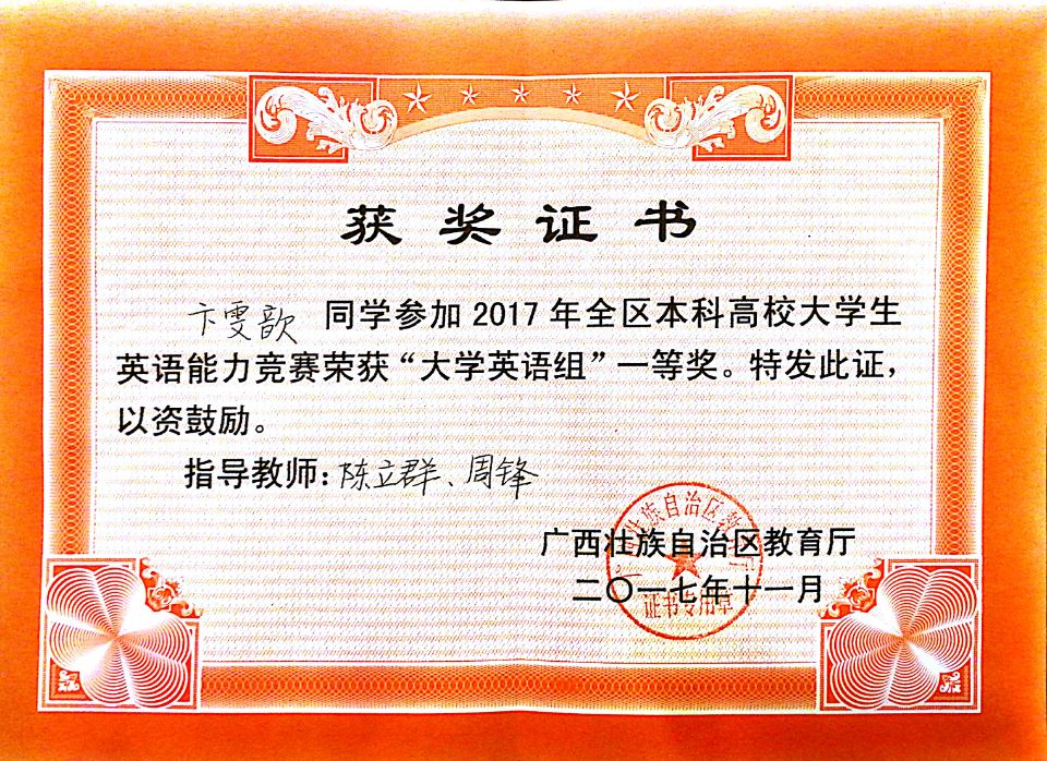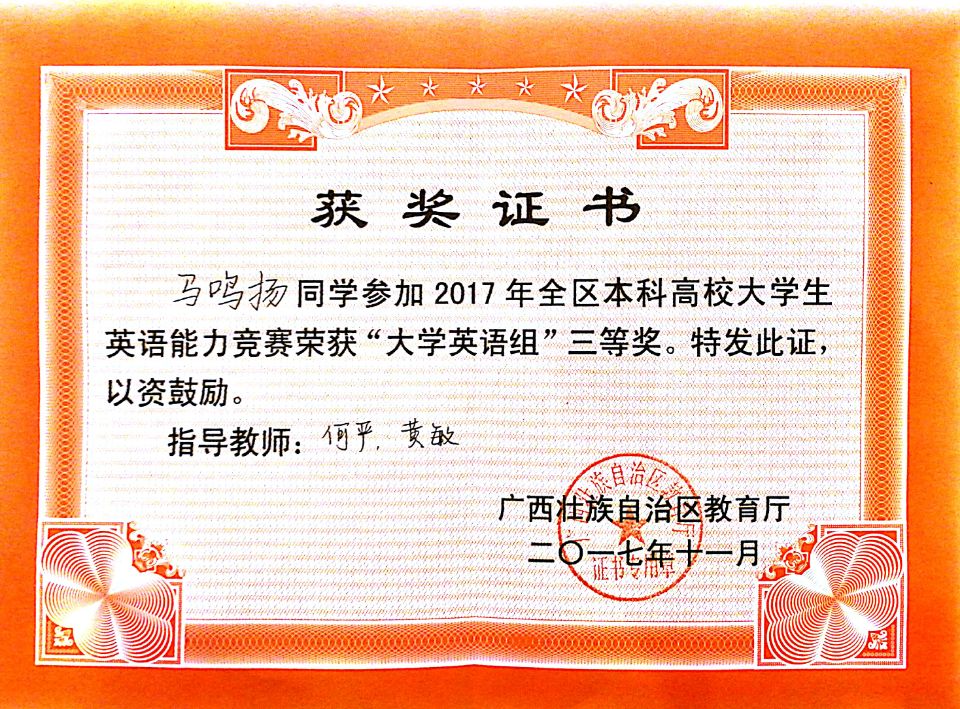 喜报:beat365官网学生获得2017广西本科高校大学生英语能力竞赛一等奖