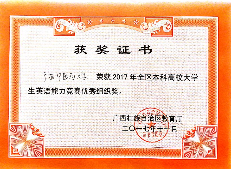 自广西本科高校大学生英语应用能力竞赛2016年开始举办以来,beat365官网已经连续两次获得一等奖和竞赛优秀组织奖,体现了大学英语教学改革和培养英语应用能力人才的成果,也将进一步激励学校深化大学英语教学改革,不断提高外语教学质量。