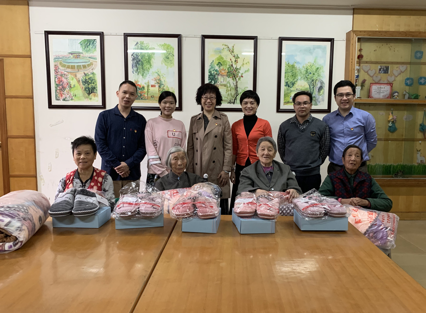 在广西重阳老年公寓,党员们仔细询问老人的生活起居、餐饮、冬季御寒等生活情况,详细了解老人们的身体和生活状况,为老人们送上了棉鞋、毛毯、暖手宝等生活用品,帮助老人们迎接即将到来的寒冬,并祝愿他们健康长寿、晚年幸福。