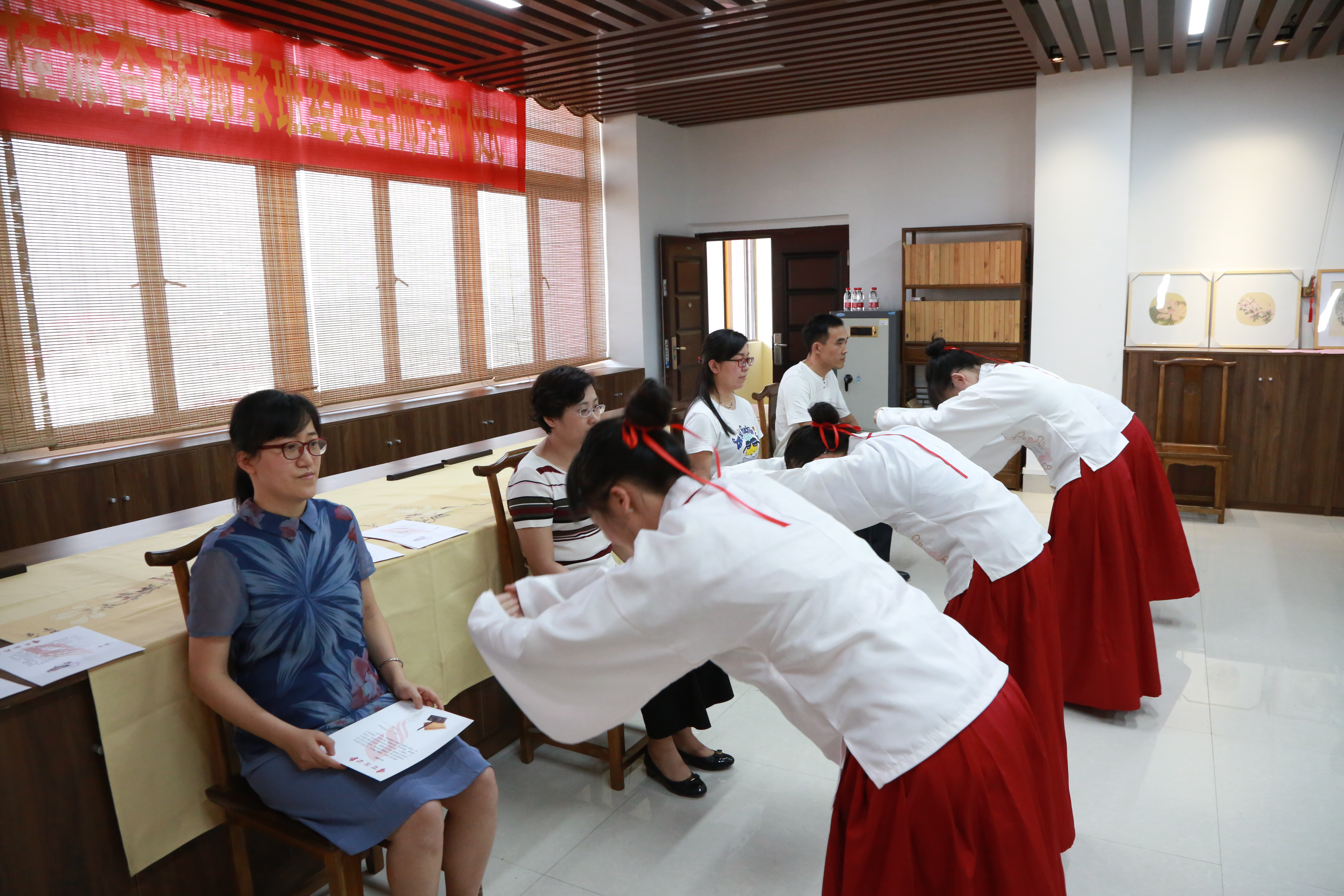 为继承中医文化精髓,遵循中医学术师承授受的教学规律,继续发挥中医师承教育与院校教育相结合的教学优势,培养一批热爱中医药事业、对中医经典理论兴趣深植于心,虚心好学的中医学学生,更好地执行自治区政府“桂派杏林医学生师承教育项目”,6月30日下午,在教务处和基础医学院的组织下,2018级中医学桂派杏林师承班举行了经典导师拜师仪式。基础医学院蒋筱、陈贵海、张静、武丽、张亚萍、韦玉娜、余浚龙、王文杰等8位经典导师参加拜师仪式。2018级中医学桂派杏林班的39位同学浓郁的中国传统文化背景下,身着汉服分别向自己的导师行郑重而庄严的拜师礼,同时呈上拜师帖,与导师建立了更紧密的中医经典学习的师徒关系。