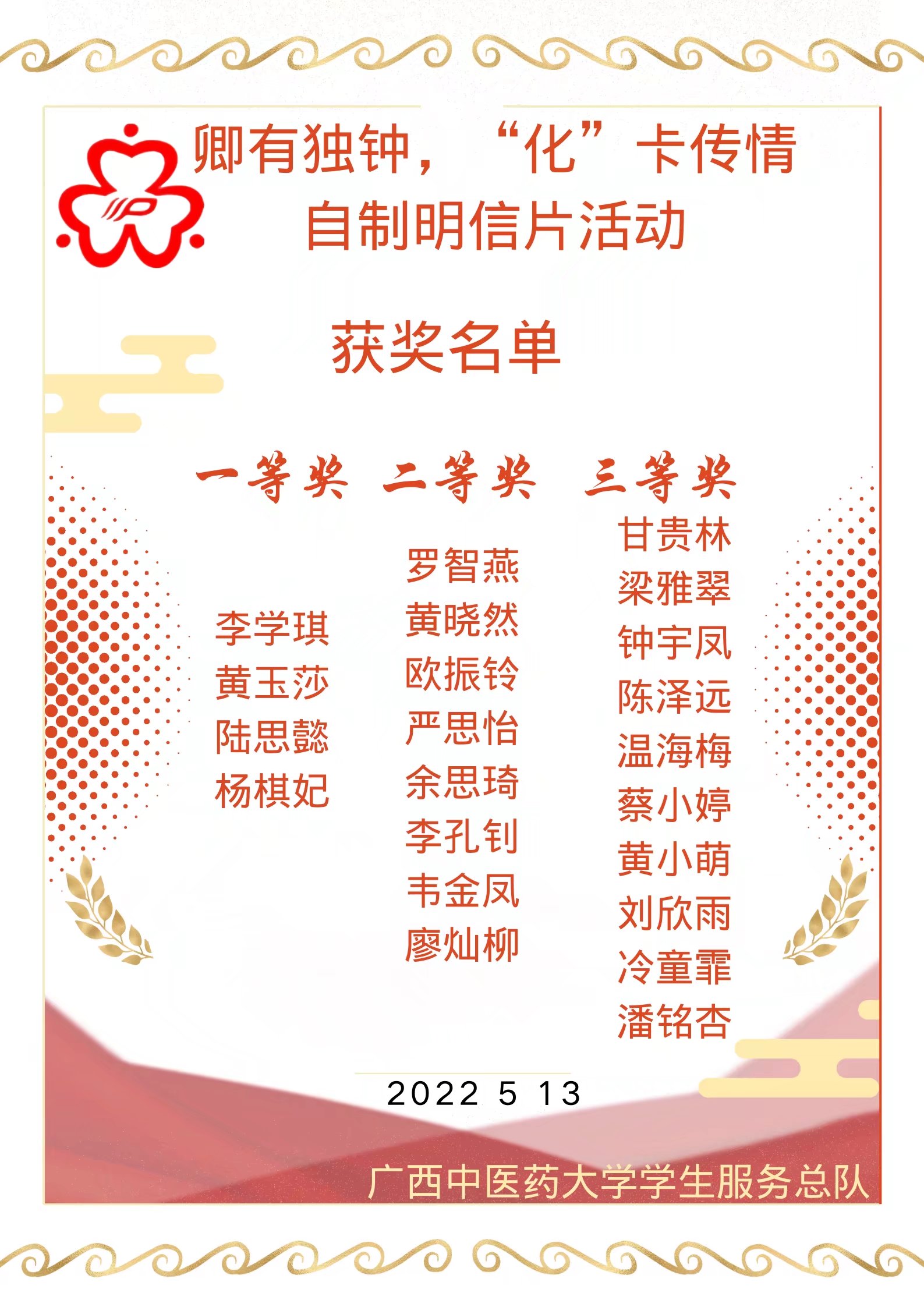 为丰富大学生在校学习生活,激发学生的创作灵感与设计热情,营造和谐健康的校园文化氛围 ,beat365官网于2022年5月份开展了由beat365正版唯一入口必一学生资助管理中心主办,广西中医药大学学生服务总队承办的“卿有独钟,‘化’卡传情”主题自制明信片活动。