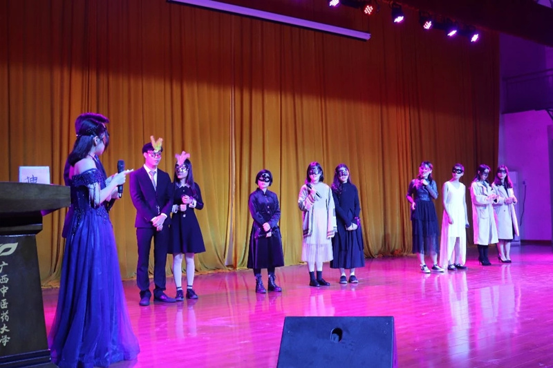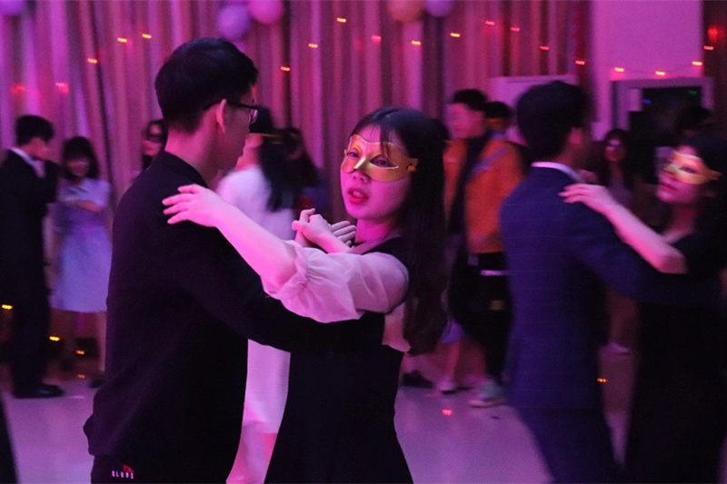 南国有佳人,轻盈绿腰舞。舞会现场同学们带着面具,男生身着正装,女生披上华丽的礼服,随着音乐翩翩起舞。此次舞会共有三个回合,第一回合的中场环节进行的“我爱猜歌名”的小游戏为舞会预热。第二回合的舞蹈在欢愉的气氛中开始。中场休息时,灵兰漫研社为同学们带来了一场华丽的cosplay走秀。同学们踏着台步踩着点,在舞台上彰显自我。第三回合在绚丽的灯光下,伴着华尔兹,迎来了舞会的落幕。
