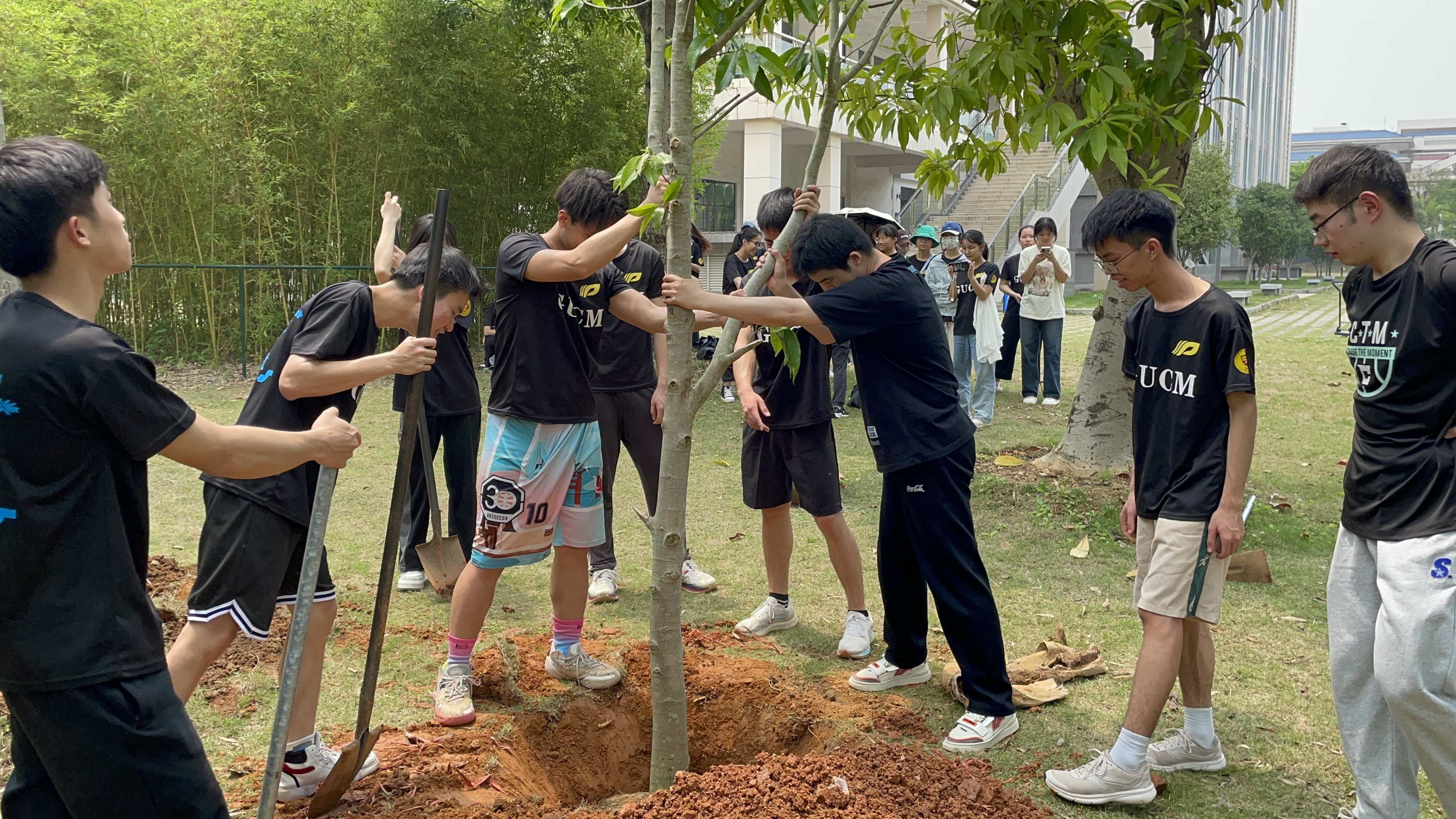 活动过程中,运动防护队的队员们分工合作,有的挥锹铲土,有的扶树填土,有的培土浇水,各个环节衔接有序,配合默契;队员们在欢声笑语中挥洒汗水,用双手种下了白玉兰幼苗。或许多年后当我们回来看望母校,看到已茁壮成长、花香四溢的白玉兰,已成为学弟学妹们夏日朗诵背书的庇荫之地时,能忆及学校对我们的恩情,想起当时青春的我们那张扬放肆的奔跑,为理想振翅高飞的轨迹,奔赴梦想坚持前行的步伐。青春烨烨,理想莹莹,感恩之心也当灼灼。