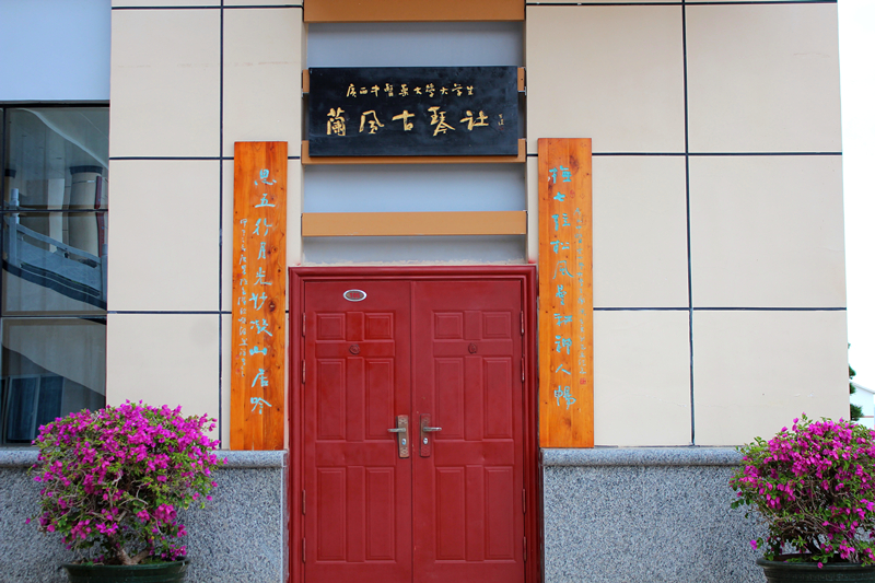 图书馆一楼的大学生兰风古琴社成立于2014年,是广西高校首个大学生古琴社。古琴琴理和中医理论可谓颇有相通之处,同源于包容性及强的中国古代哲学。古琴具有“清、微、淡、远”的音 色及其追求的“中、正、平、和”境界,与中医“阴阳平衡”、“保合太和”的精神追求非常相契;琴有角、徵、宫、商、羽五音,对应木、火、土、金、水五行。而人体五脏肝、心、脾、肺、肾也与此相应。古琴社的成立不但丰富了校园文化生活,陶冶了学生情操,还有助于培养青年大学生的人文修养,弘扬传统文化,促进文化交流等。对联:“思五行松风曼和神人畅;抚七弦月光妙凝山居吟”。