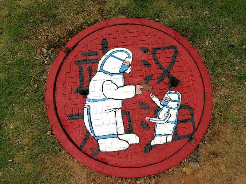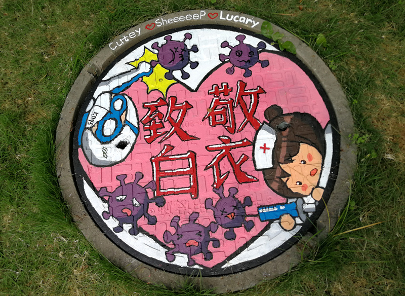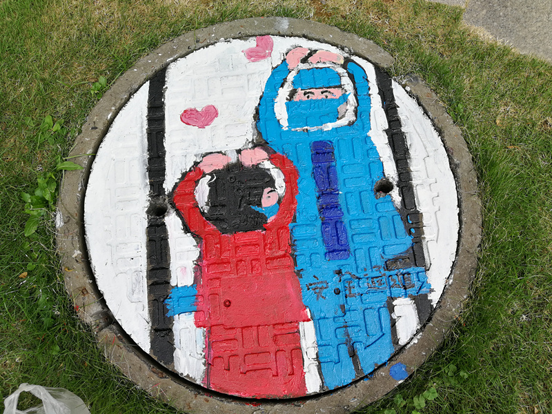 “素手慧心写丹青,彩笔井盖绘巧思。孩子们以井盖为布,青春为笔,情牵疫情,致敬最美逆行者!”一位老师在自己的朋友圈中写道。