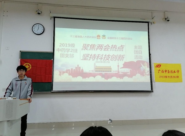 为深入学习贯彻今年“两会”重要指示精神,认真落实团委指示要求,2019级中药学2班团支部于4月17日晚在仙葫校区教学楼1-208教室开展了“聚焦两会热点,坚持科技创新”主题团日活动。