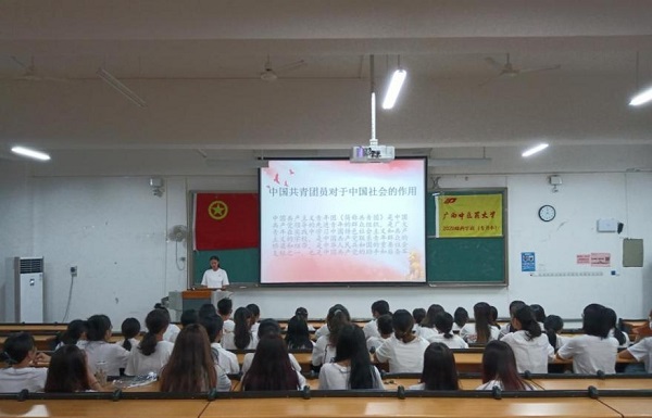 会上,主持人带领各位同学了解我们所处的新时代,经济体量的增长,革命的先进成果和科技上量子通信与登月的进步,让同学们认识到国家正朝着全面建设社会主义现代化国家、全面推进中华民族伟大复兴而团结奋斗。在全体同学坚毅的信心和眼神中,宣誓重温入团誓词和奏唱团歌。同学们意识到正处青春风华,应做一个有理想、有知识、能吃苦、肯奋斗的当代青年大学生,将个人理想融入到党和国家的事业中,不忘初心,牢记使命。