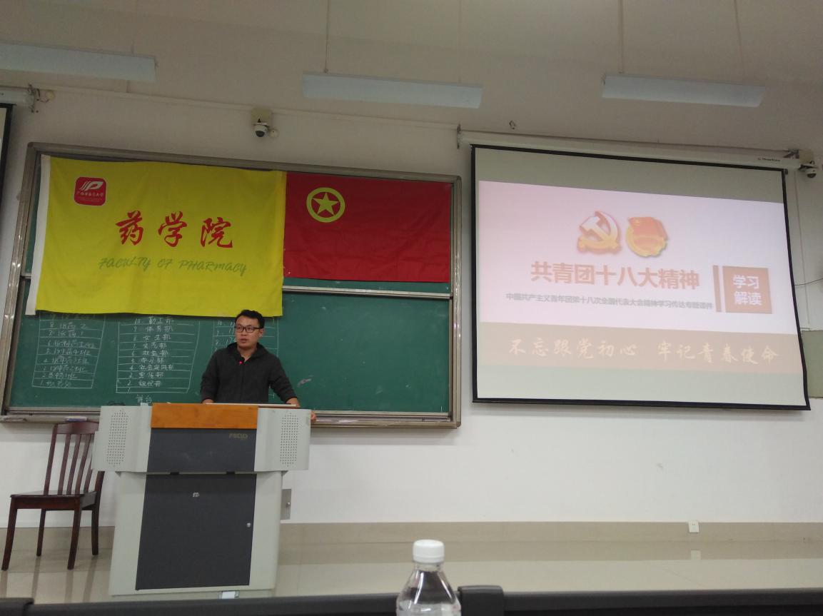为加强共青团员理论修养,加强团组织凝聚力,提高基层团干部战斗力,明确团组织今后工作发展的方向和目标,药学院分团委举办了10月16日16:30于教学楼1–201教室举办“不忘初心跟党走,牢记青春使命”为主题的共青团十八大精神解读的学干培训班,培训班由分团委书记黄鑫老师主讲,药学院全体学生干部、学生团支部书记参加了培训。