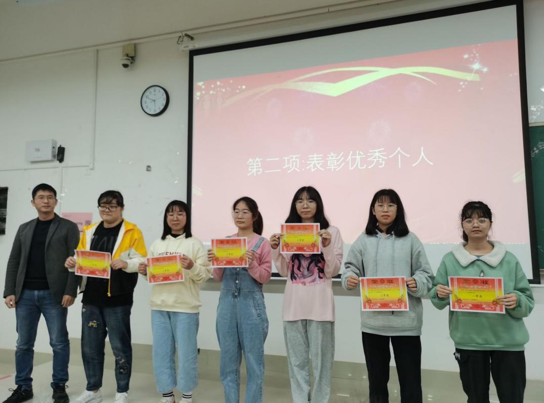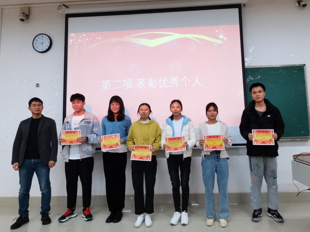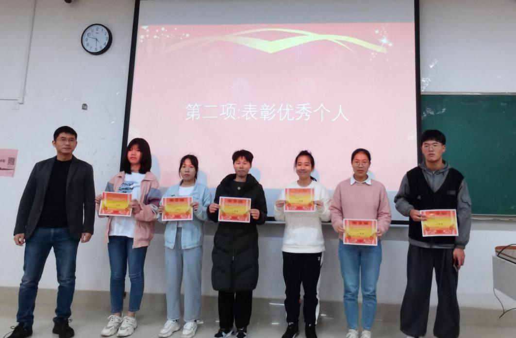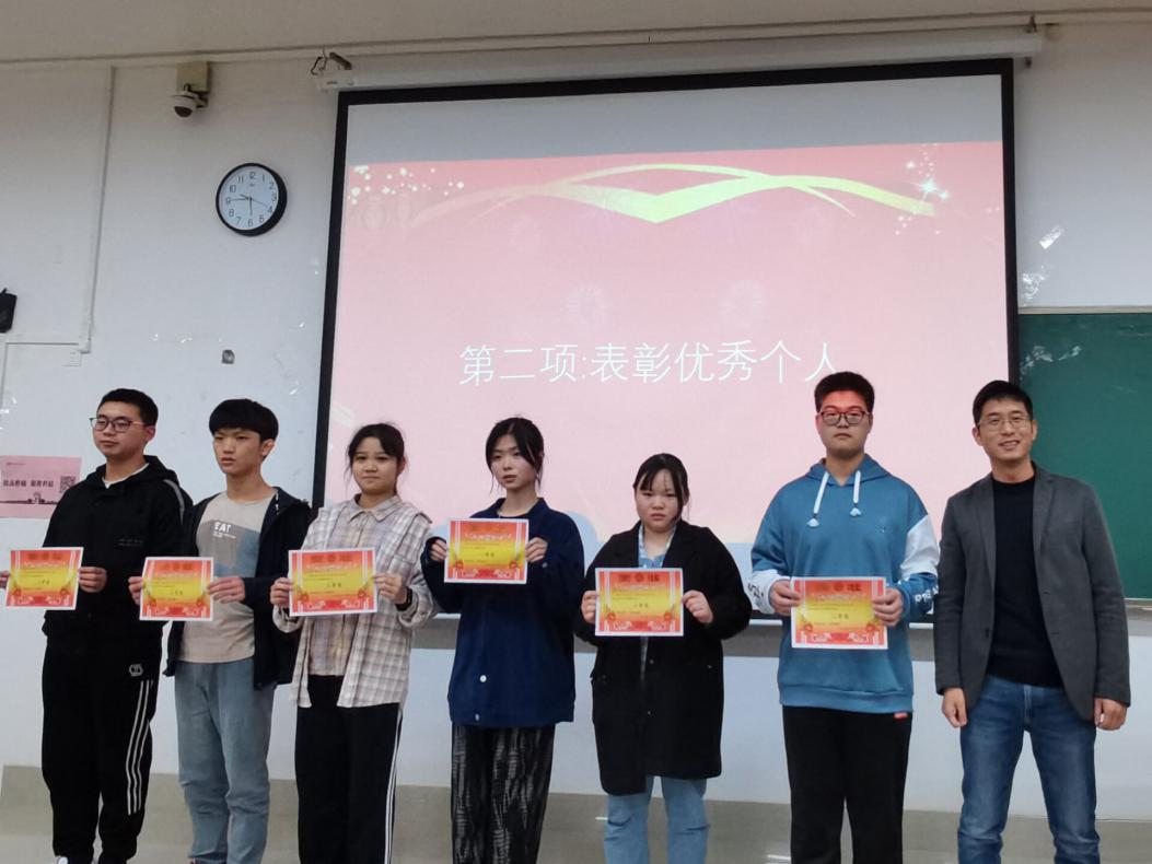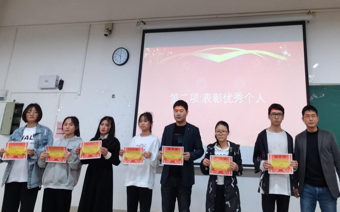 大会伊始,为表彰先进,树立典型,发挥先进典型模范带头作用,激励广大学生奋发有为、争先创优的精神风貌,依据上学期期末考试成绩,年级研究决定对各班成绩优异的同学进行表彰。各班奖励一等奖一名,二等奖两名,三等奖三名。表彰环节,年级委主席刘力嘉宣读表彰决定及获奖人员名单,辅导员吴玉峰老师颁发奖状并合影。