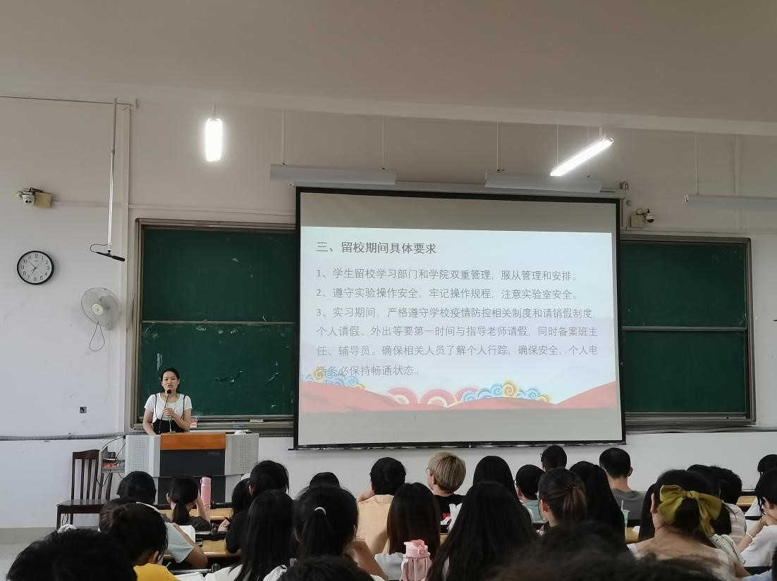会上,刘航老师和潘翠柳老师从暑期放假时间安排、学生个人安全、留校相关管理工作以及疫情防控四个方面进行强调要求。会议强调,暑假期间同学们应该重视自己的人身安全,积极锻炼身体、增强体魄,不轻信他人、结伴出行,提高自身安全意识和自我防控意识;留校学生应遵守留校的要求和注意事项,严禁在宿舍使用大功率电器,不得留宿他人,不得夜不归宿,每天按时向留校指导老师报备个人行程;同时也对疫情防控做出提醒,要求放假期间要保持警惕、严密防范,不聚会、不串门,随身常备口罩,去到人群密集地方佩戴口罩,注意个人卫生,做到“戴口罩、勤洗手、多通风、不聚集、用公筷”,养成健康卫生生活习惯。