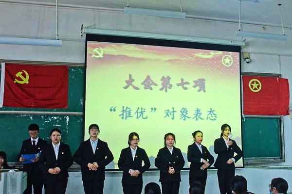 会议伊始,全体参会人员齐唱团歌,并由党支部代表组织学习推优知识。经短暂介绍推优对象名单后,推优对象依次上台介绍自己,并通过现场问答、民主评议、团支委评议、民主表决对六名推优对象进行审议。六名推优对象都准备充分,流利应对现场问答,对问题有自己独到的见解,并表示对党事业的支持与忠诚。在观看团支部剪辑视频后,主持人宣读投票结果,秉持着严谨公平公正的态度,六名推优对象全部通过,至此本次示范推优大会圆满结束。