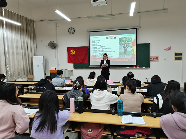 第三部分:支部书记总结。孙慧玲老师强调一个党员就是一面旗帜,要牢记党员身份,在方方面面规范自己的言行举止;加强理论修养,不断巩固、强化正确的入党动机。此外,孙老师嘱咐考研的同学要稳住心态按部就班的学习,找工作的同学要多尝试、积极就业。