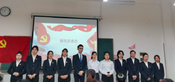 第二部分:支部书记孙老师带领新党员进行入党宣誓、老党员重温入党誓词。