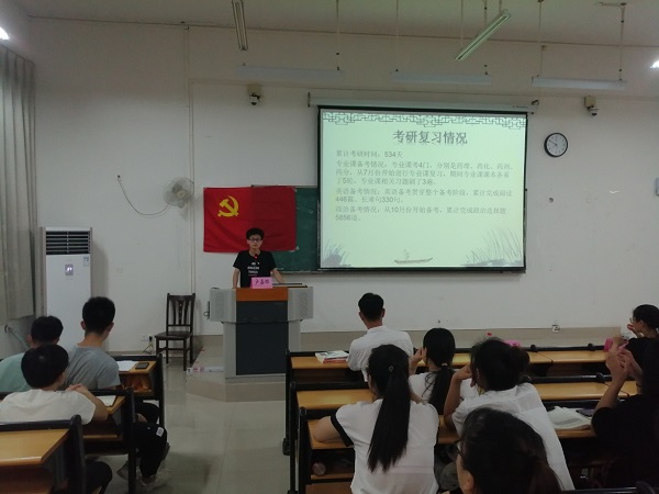 会议分两个部分,第一部分由兰旋同志通过PPT与视频相结合的方式,带领党员群众学习五四精神。第二部部分由卢嘉烨(考研至中山大学)、奉知知(签约安琪酵母有限公司)、陈玫容(签约新希望六和股份有限公司)、陈忠金(签约阿斯利康有限公司)四位2019届准毕业生党员分享他们在考研、求职面试、实习、毕设等方面的经验,并针对同学们提出的困惑和疑问,给予悉心解答。会议现场气氛活跃,互动性强。会议最后,支部书记孙慧玲对此次活动进行点评,并对同志们今后应如何更好学习和工作提出要求与建议。