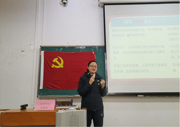 12月5日下午,药学院食品学生党支部书记孙慧玲在2-206教室给支部党员、入党积极分子等30余人讲授《发展全过程人民民主,保障人民当家作主》主题党课,党支部组织委员黄玉莹开场介绍。
