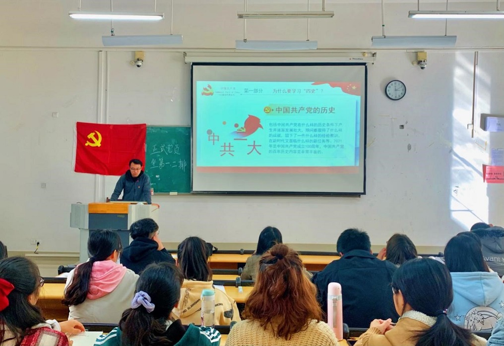 黄鑫老师分别从为什么要学习“四史”、深刻理解“四史”的重要价值 、学习“四史”所要达到的目标等方面为大家解读学习“四史”的必要性,指出作为一名党员,要认真学习“四史”,无论是党史、新中国史、改革开放史、社会主义发展史,特别是将要接收为预备党员的发展对象和即将转正的预备党员跟是要加强这些党的相关理论、历史知识的学习。同时作为一名党员应时刻把人民群众的利益放在第一位,有全心全意为人民服务的决心,做好自己的本职工作,在实现个人价值的同时,也为社会的发展,为人类进步贡献了自己的微薄力量。