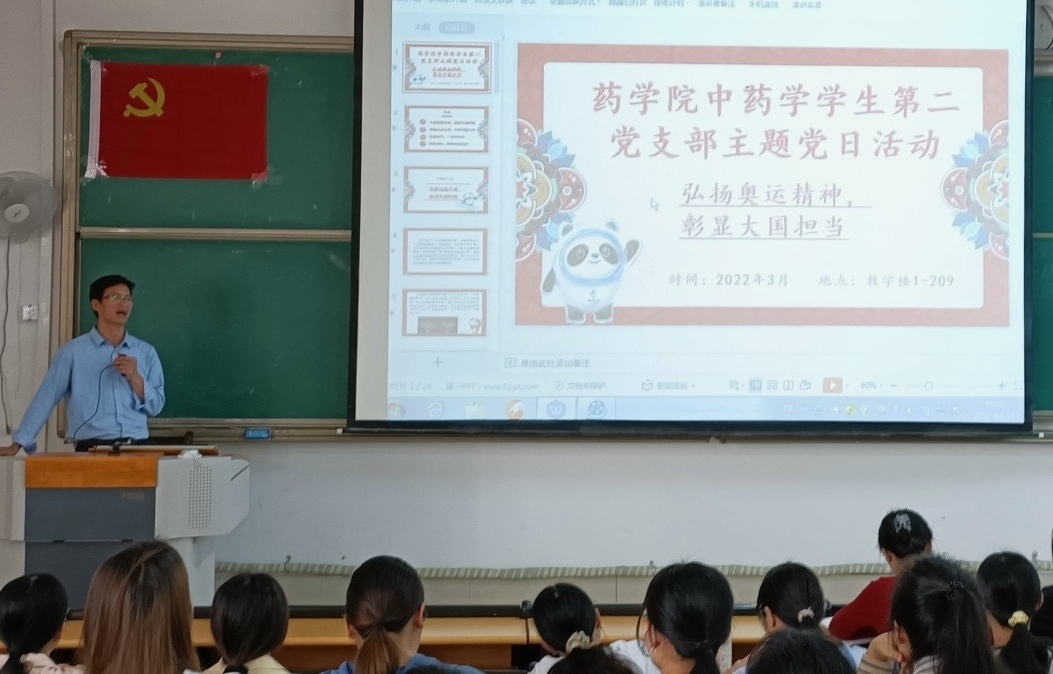 3月15日下午,药学院中药学学生第二党支部在仙葫校区1-209教室开展了“弘扬奥运精神,彰显大国担当”主题党日活动。药学院党委副书记李豫萍出席指导活动,支部党员、党员发展对象与入党积极分子参会,支部书记凌勇威主持活动。