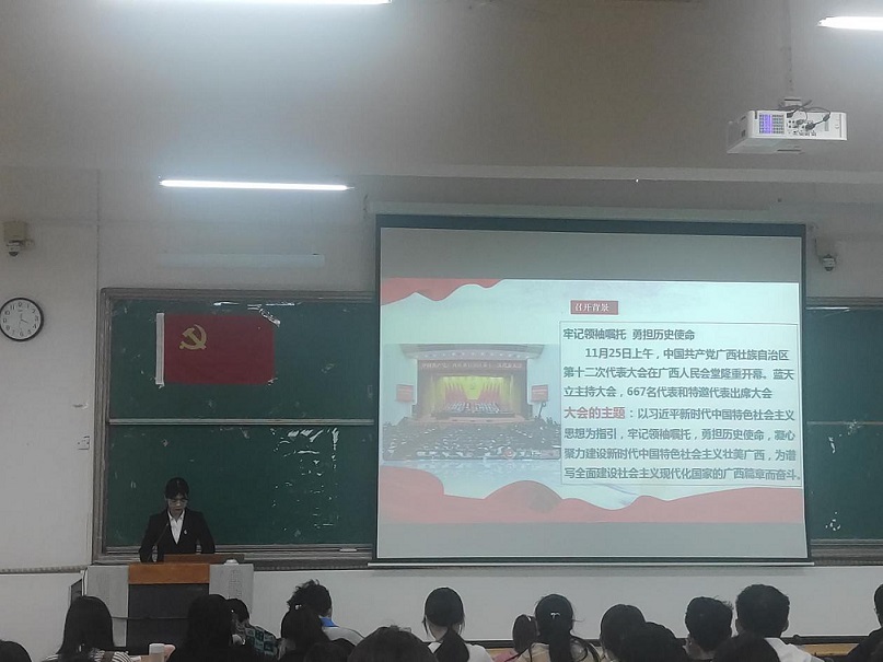 中国共产党广西壮族自治区第十二次代表大会,是在“两个一百年”历史交汇点上开启全面建设社会主义现代化国家新征程的大会,为认真学习贯彻此次大会的重要讲话精神,药学院中药学学生第一党支部于2021年11月28日在教学楼1-203组织展开集中学习“中国共产党广西壮族自治区第十二次代表大会”活动,活动由冯于波同志主持,支部全体党员、发展对象、以及入党积极分子共82人参会。