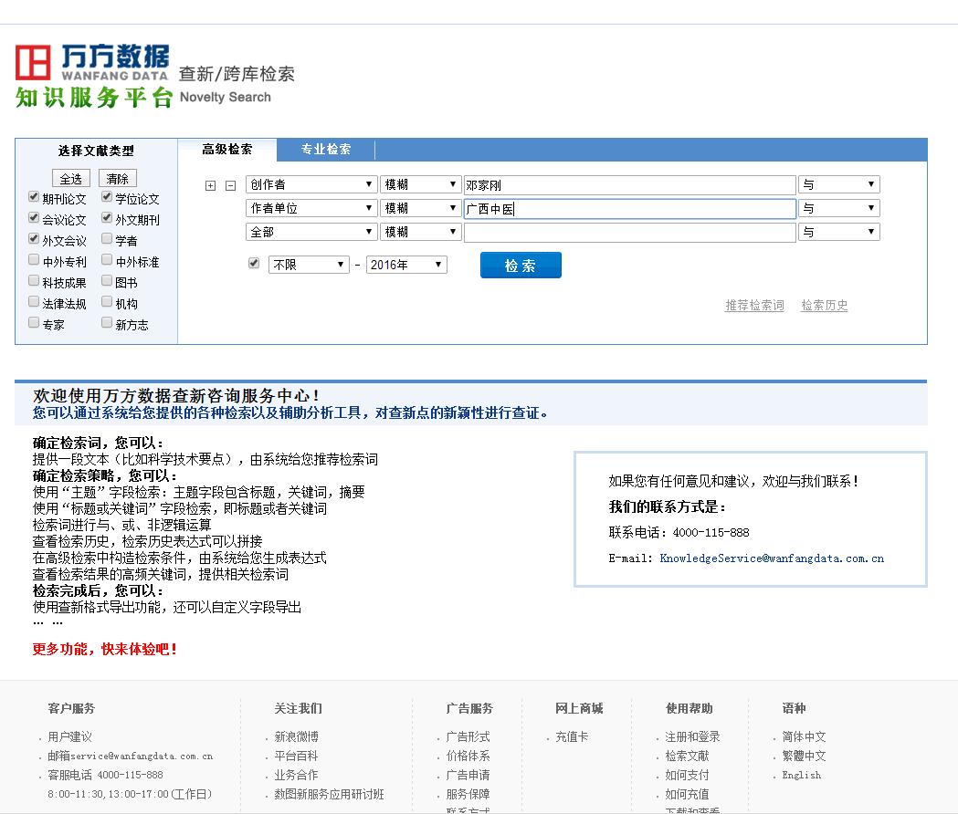 (1)选择检索途径,在检索框输入检索词进行检索:在万方高级检索界面中,检索途径选择创作者和作者单位,检索框输入检索词创作者=邓家刚AND作者单位=广西中医,点击检索图标进行检索