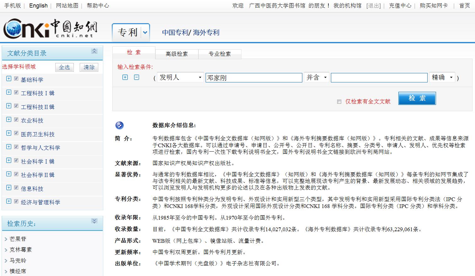 (2)选择检索途径,在检索框输入检索词进行检索:在CNKI数据库专利检索界面中,检索途径选择发明人,检索框输入检索词邓家刚,点击检索进行检索