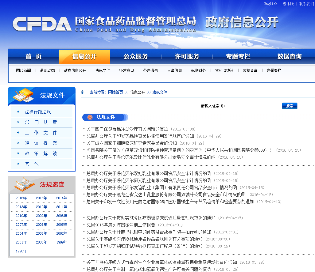 (2)检索有关法规文件:鼠标移到信息公开,在其项下点击法规文件,点击其中一条法规,就可以阅读法规全文。
