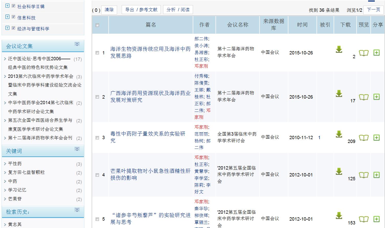 (3)进入检索结果界面:搜索到有关银杏叶药理作用的会议论文25条