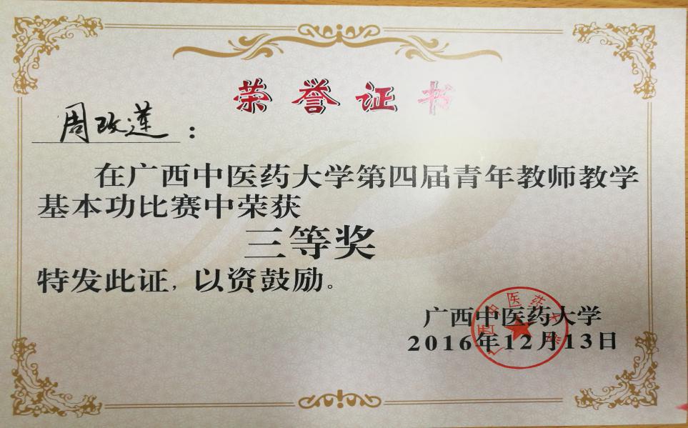 2016年12月13日,在仙葫校区教室举行的beat365正版唯一入口必一第四届青年教师教学基本功比赛中,我科室周改莲获三等奖并同时获得最佳教学设计奖。beat365官网举办的青年教师教学基本功大赛已成为beat365官网青年教师互相交流、学习和展示的一个重要平台,本次比赛教学内容丰富,参与范围广泛,参赛青年教师教学水平,特别是PPT制作水平明显提高。学校举办的基本功比赛有效地促进了青年教师教育教学能力的提升,进一步调动了青年教师投身教学工作的积极性和主动性,达到了相互借鉴、共同提高的目的。