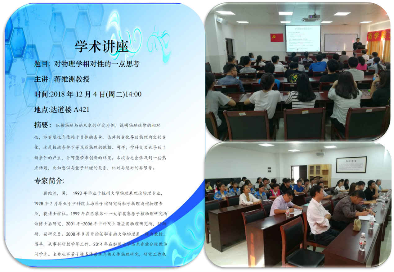 2018年12月4日下午,在达道楼A421室,数理教研室有幸邀请到了东南大学蒋维洲教授给学生开展题为《对物理学相对性的一点思考》的学术讲座,该讲座由数理教研室主任韦相忠老师主持,邀请到了药学院卢汝梅副院长出席。