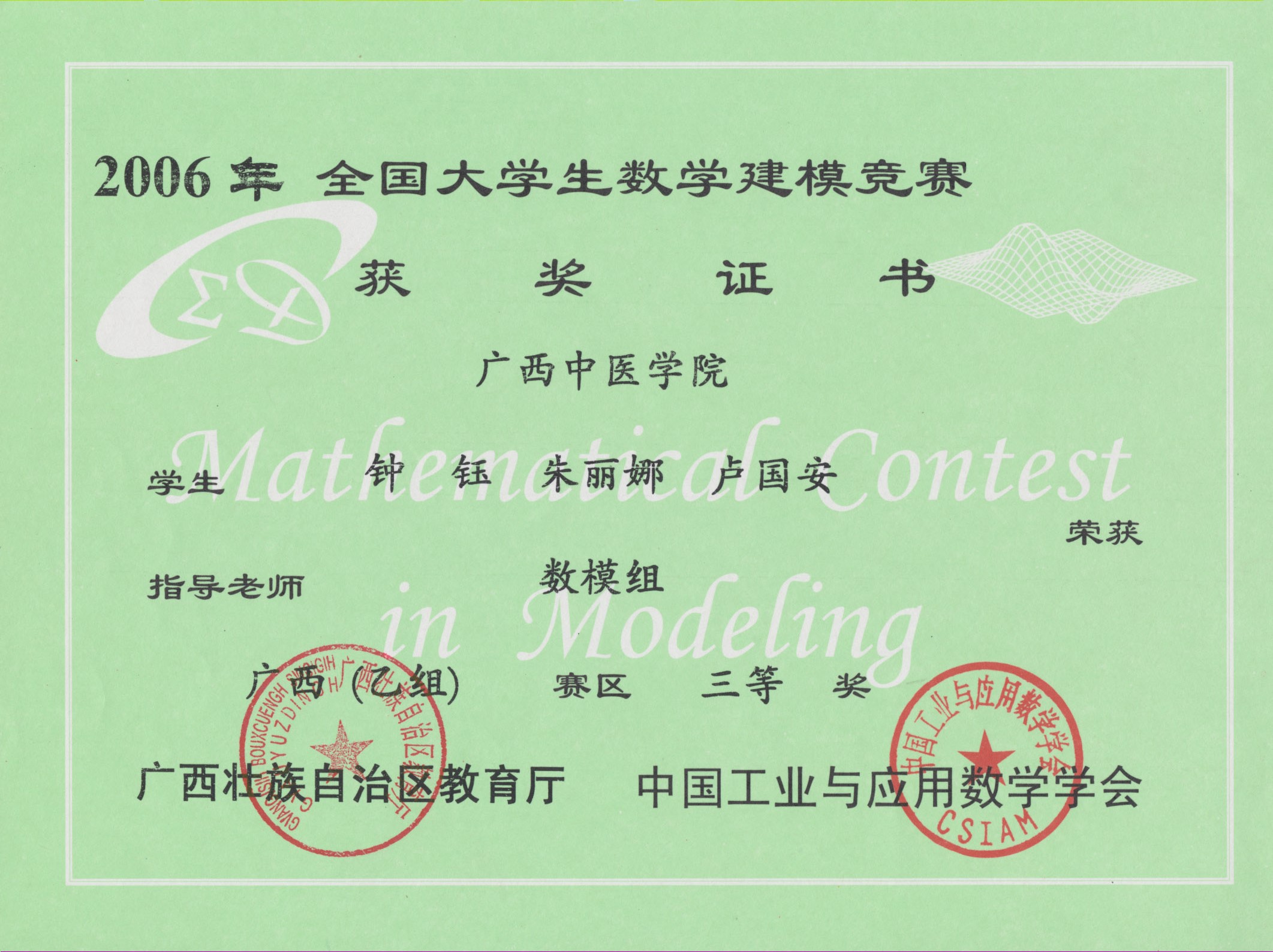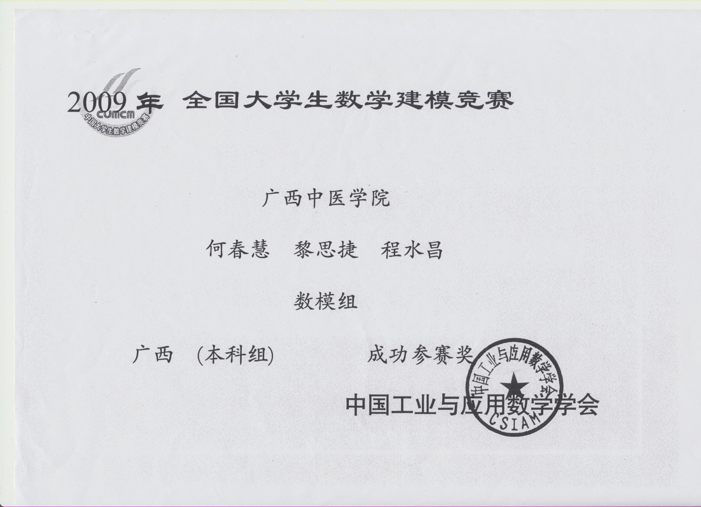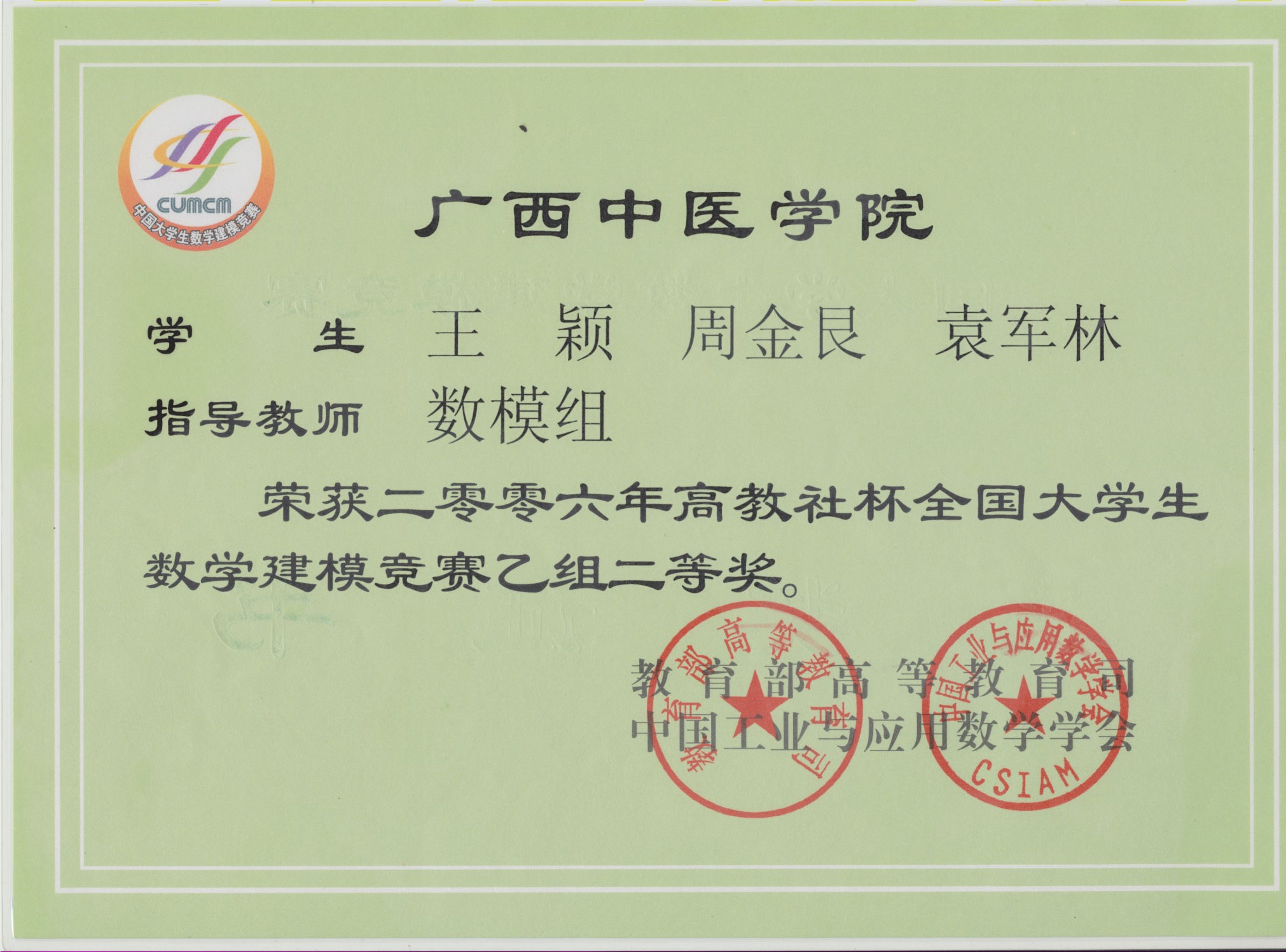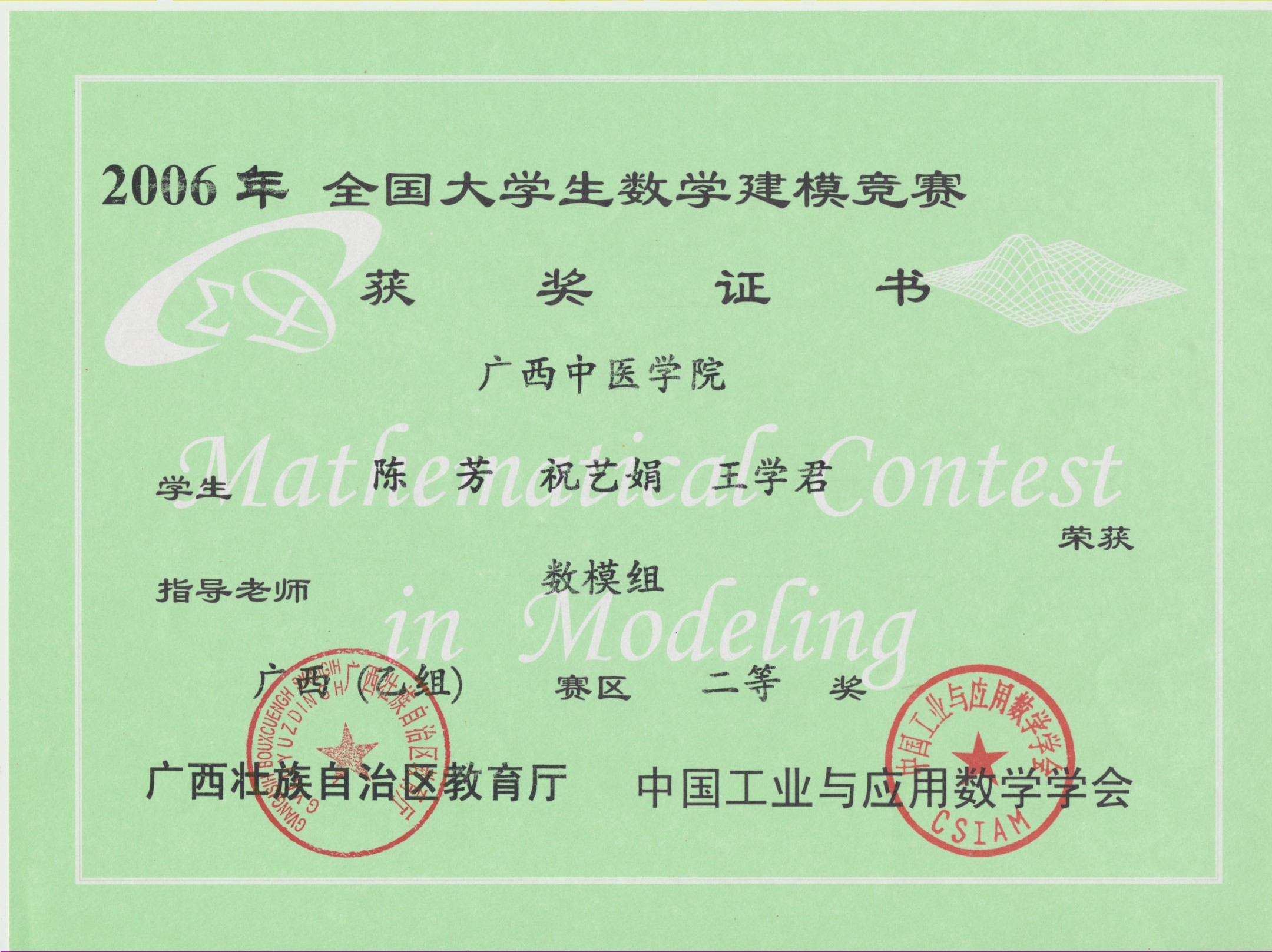 全国大学生数学建模竞赛获奖证书