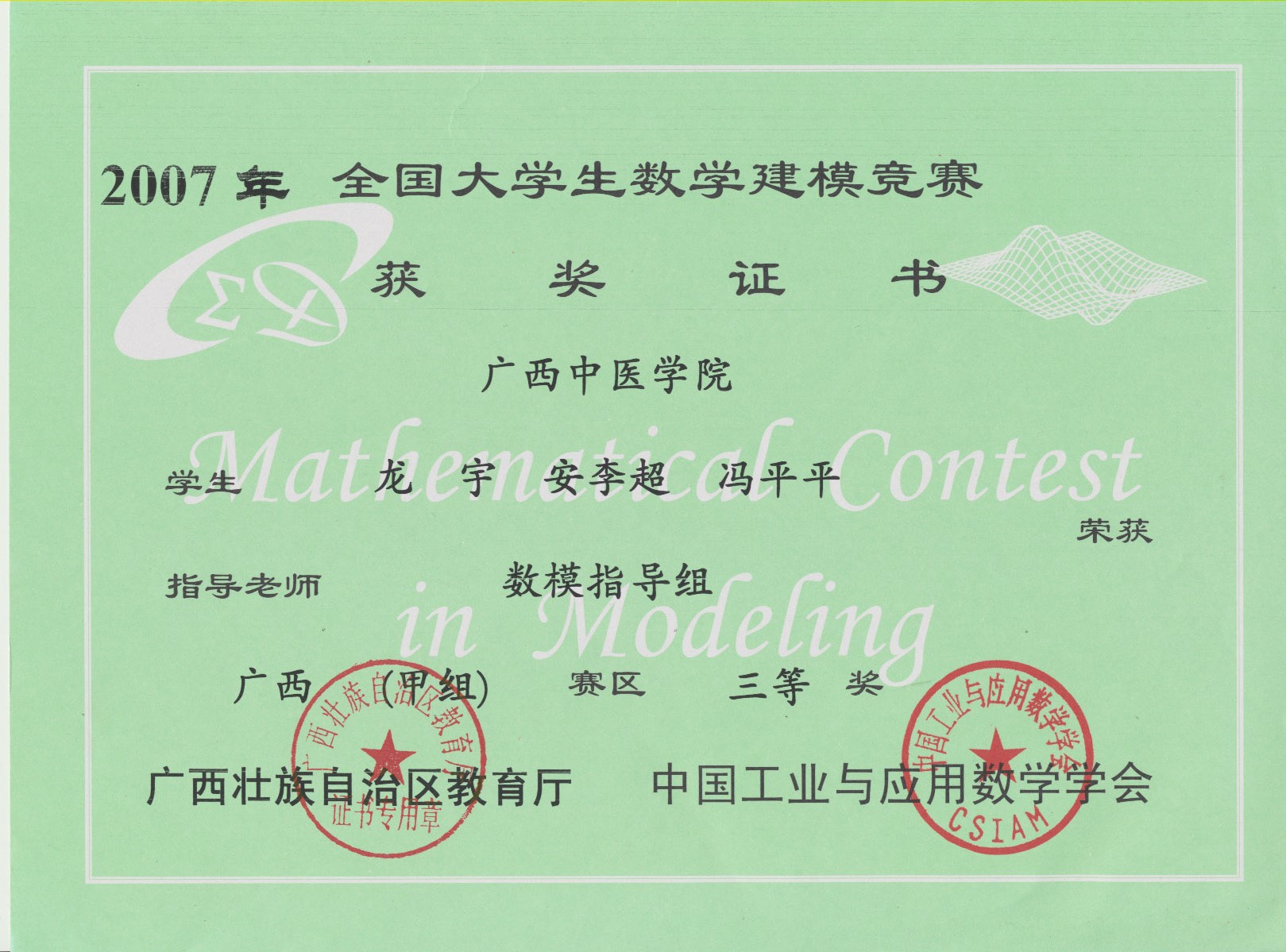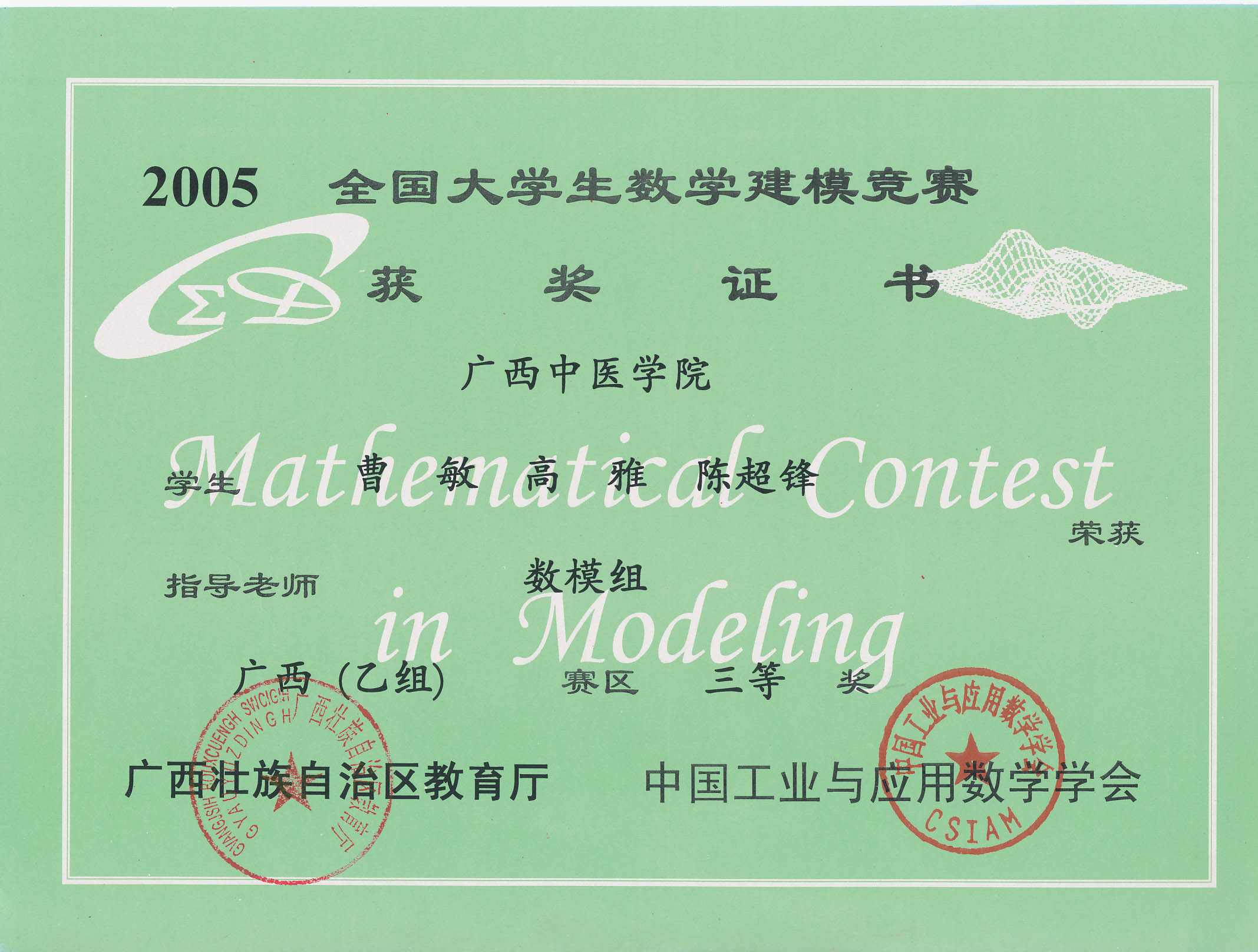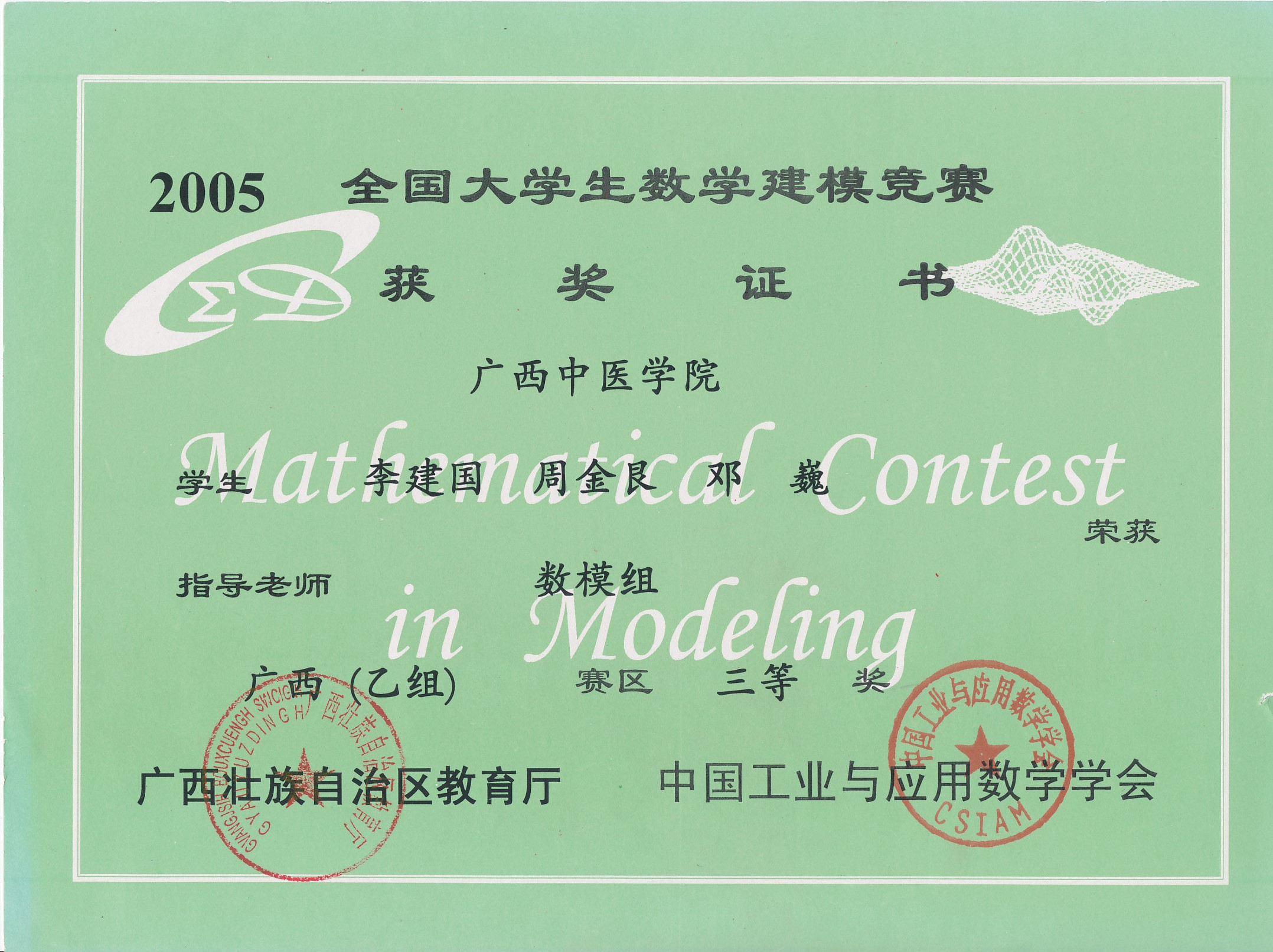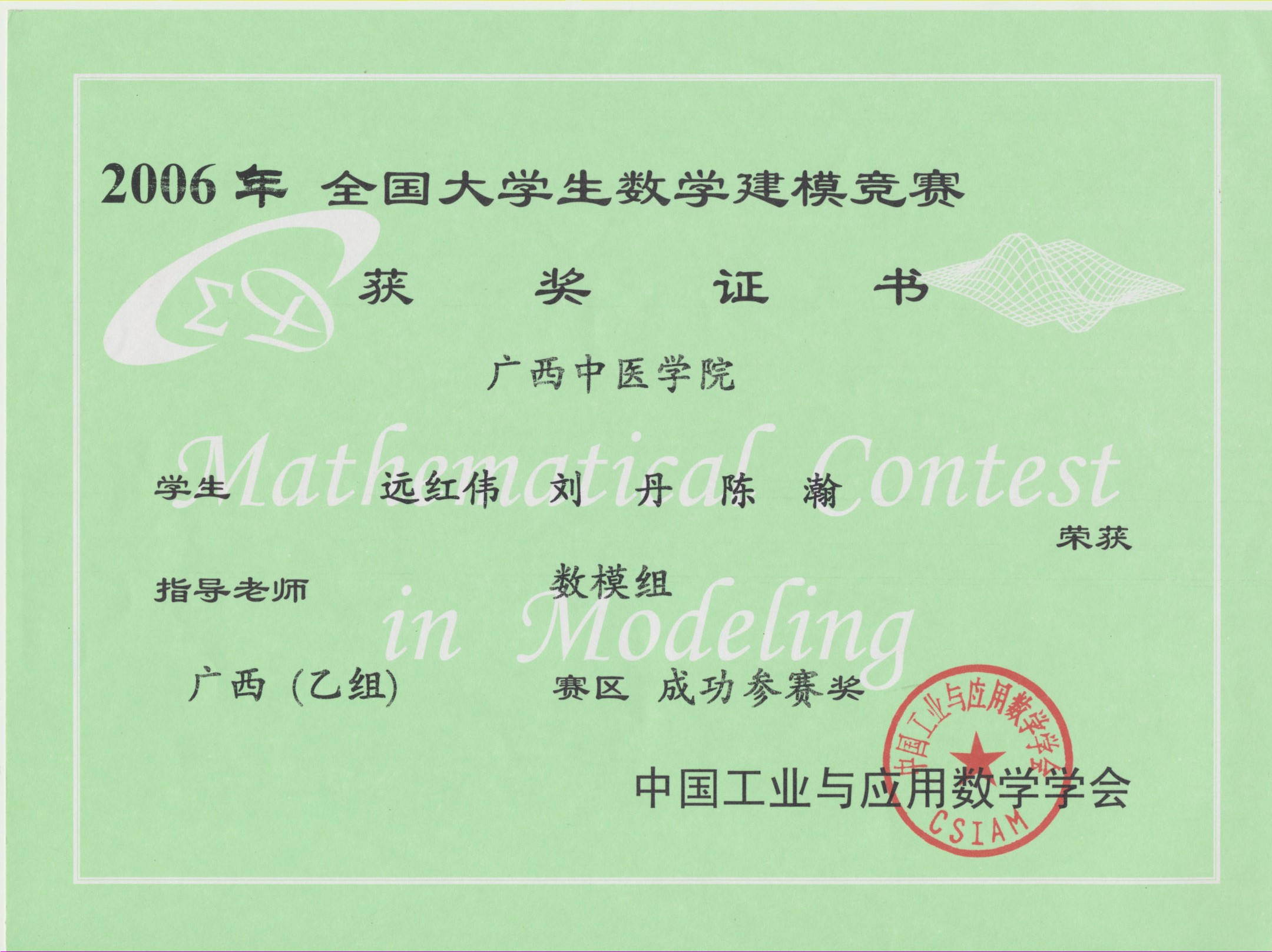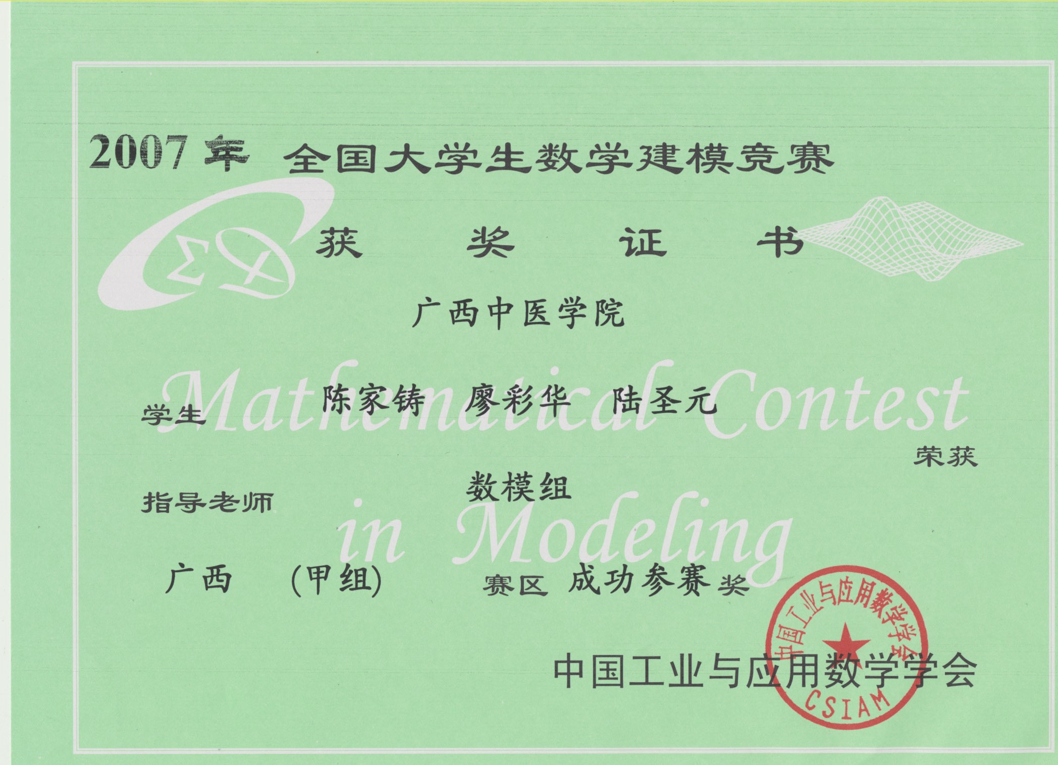 全国大学生数学建模竞赛获奖证书