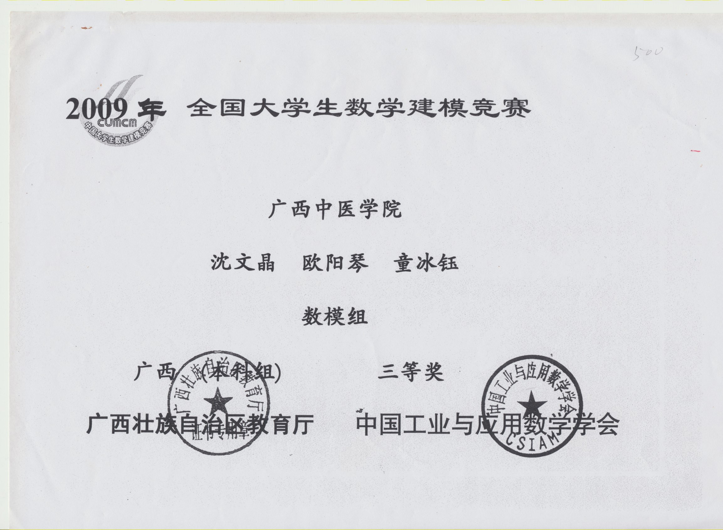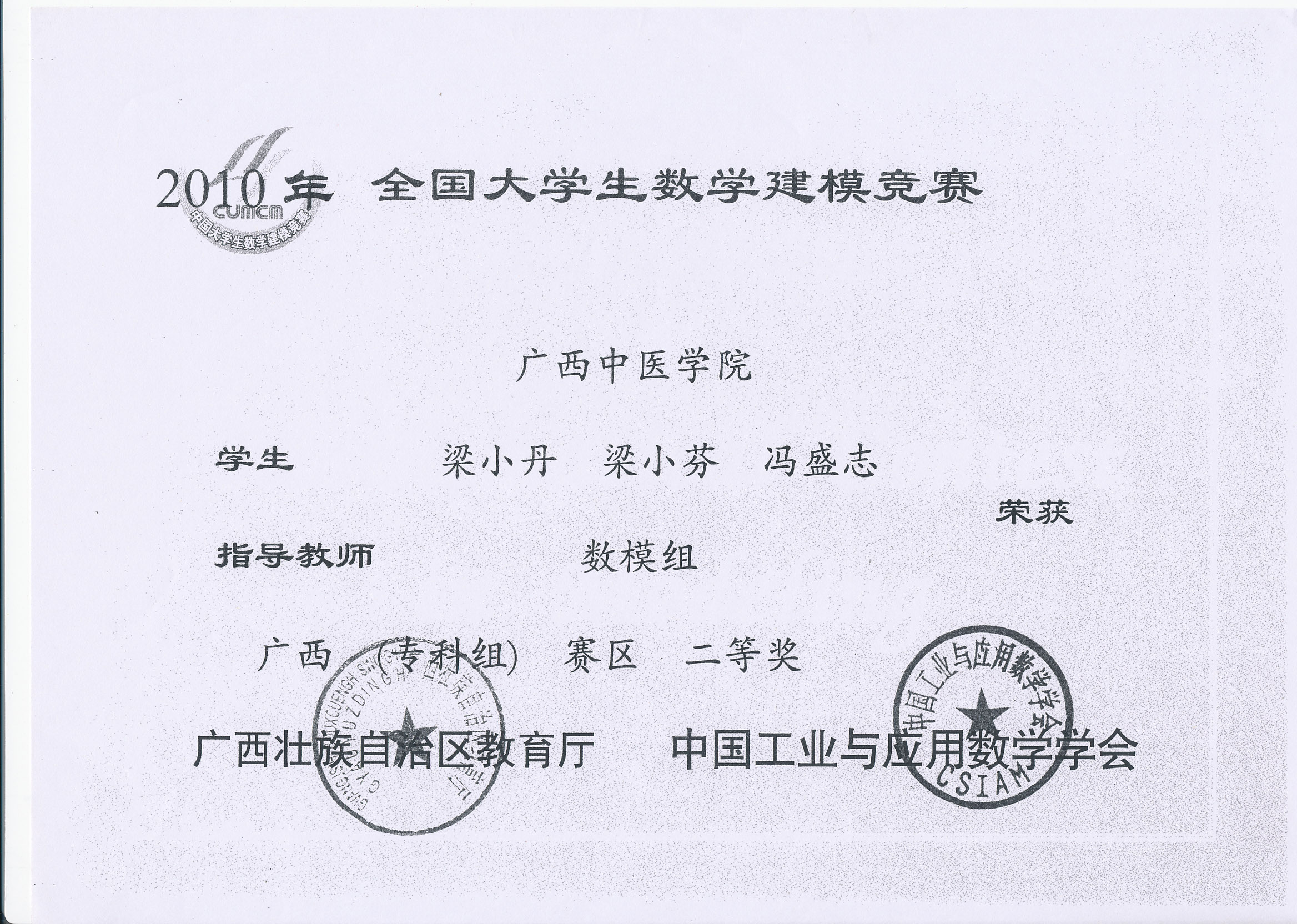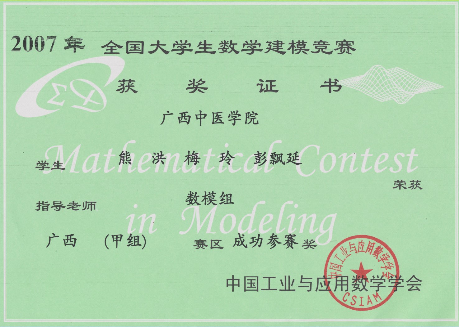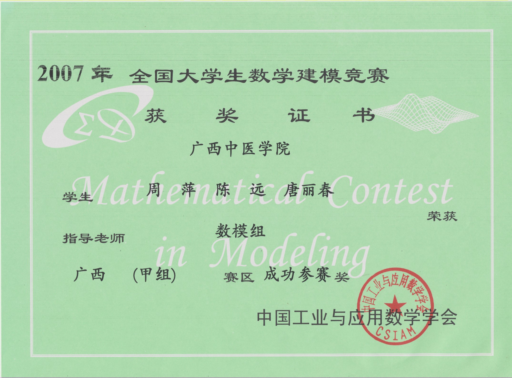 全国大学生数学建模竞赛获奖证书