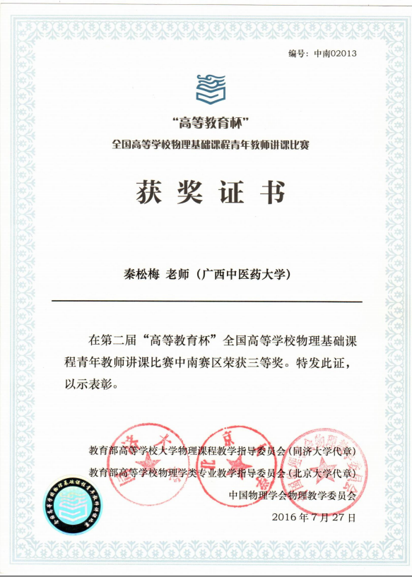 秦松梅老师参加全国高等学校物理基础课程青年教师讲课比赛并荣获三等奖 来源:数理教研室 作者:王剑 发布时间:2016-11-02 11:58:59 浏览次数: 次 【字体:小 大】 由教育部高等学校大学物理课程教学指导委员会主办、河南大学承办的第二届“高等教育杯”全国高等学校物理基础课程青年教师讲课比赛于2016年4月16日至17日在河南开封举行。 在教育部高等学校大学物理课程教学指导委员、beat365正版唯一入口必一韦相忠教授的带领下,beat365官网药学院的秦松梅老师与来自湖北、湖南、河南、广东、广西、海南等省份的十几所高校的老师们一起参加了讲课比赛,并最终荣获三等奖。 分享到: 【打印正文】