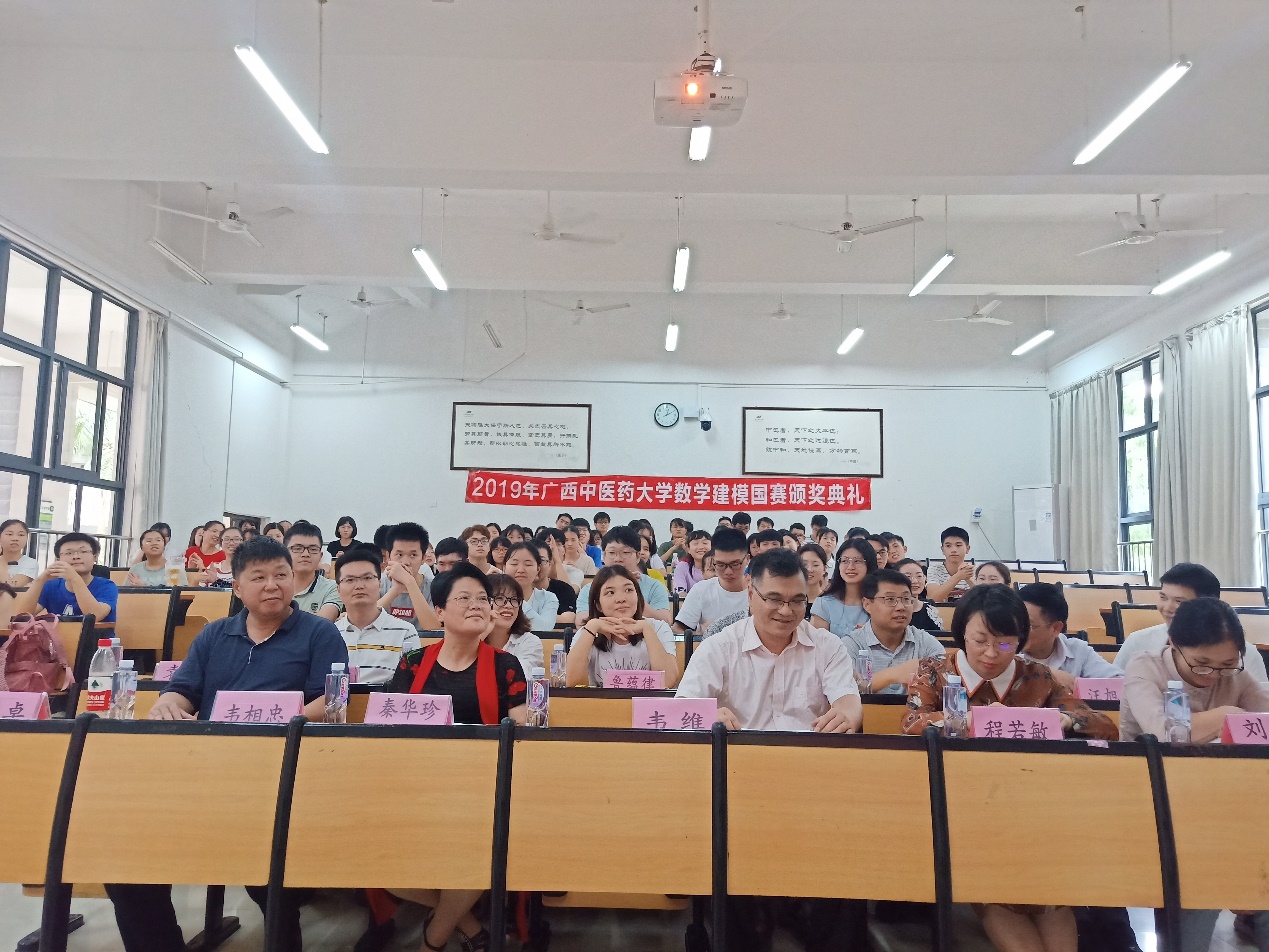 颁奖典礼由来数理教研室主办,教务处副处长韦维、药学院副院长秦华珍等领导出席了颁奖典礼,教务处程若敏科长、药学院数理教研室主任韦相忠、数模竞赛指导教师团队的老师们、基础医学院等学院的辅导员们及80多名学生参加了本次颁奖。