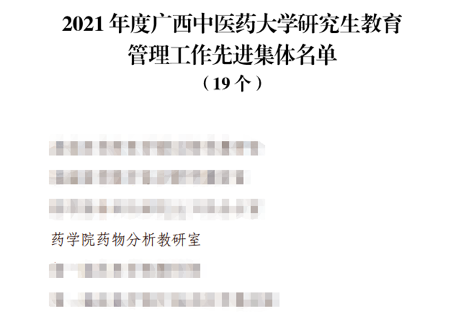 药物分析教研室喜获2021年度研究生管理荣誉 发布时间:2023-01-06 12:09:21 浏览次数: 次 【字体:小 大】 在教研室主任梁洁老师的带领下,经教研室全体教师的共同努力,药物分析教研室积极开展研究生教育管理工作,为社会输送了一批优秀的硕士研究生,荣获beat365正版唯一入口必一2021年度研究生教育管理工作先进集体荣誉称号。 图1 beat365正版唯一入口必一2021年度研究生教育管理工作先进集体名单截图 分享到: 【打印正文】