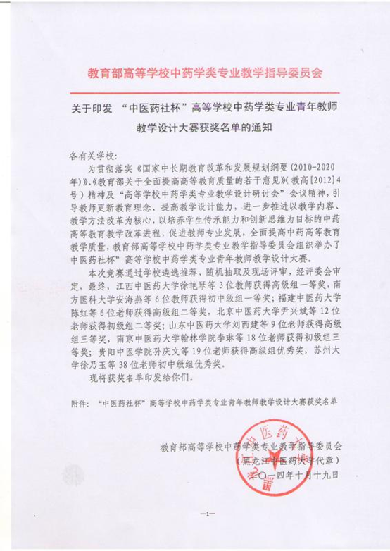 教研室廖彭莹讲师参加“中医药社杯”高等学校中药学类专业青年教师教学设计大赛喜获三等奖 发布时间:2016-03-29 14:47:10 浏览次数: 次 【字体:小 大】 我教研室廖彭莹讲师参加“中医药社杯”高等学校中药学类专业青年教师教学设计大赛喜获三等奖 分享到: 【打印正文】