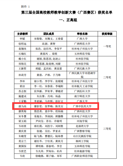 中药化学教研室在第三届全国高校教师教学创新大赛(广西赛区)获三等奖 来源:中药化学教研室 作者:图文/廖彭莹 发布时间:2023-04-21 08:59:54 浏览次数: 次 【字体:小 大】 近期,由广西壮族自治区教育厅指导,广西高等教育学会主办的第三届全国高校教师教学创新大赛(广西赛区)决赛在玉林师范学院圆满结束。中药化学教研室潘为高教授主持申报的《天然药物化学》课程创新通过层层选拔,最终获得正高组三等奖的好成绩,向区内高校全面充分地展示了beat365官网天然药物化学教学团队针对教学痛点所进行课程创新的理念、思路、方法、途径和成果。 分享到: 【打印正文】