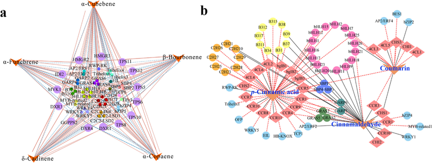 图4 肉桂中萜类和苯丙素类生物合成途径的调控网络图。 a. 萜类生物合成途径; b. 苯丙素类生物合成途径。
