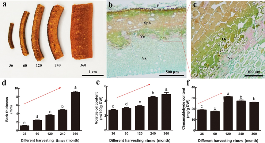 图1不同采收时期肉桂皮形态特征及生长指标。a.树皮形态。b. 36 MAP处树皮的横截面。c.次生韧皮部薄壁组织中的油细胞。d.树皮厚度。e.挥发油含量。f. 肉桂醛含量。(Oc,油细胞;P,周皮;Sph,次生韧皮部;Sx,次生木质部;Vc,维管形成层)