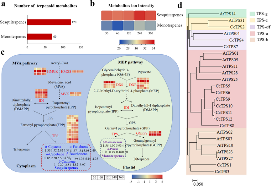 图3 不同采收时间肉桂中萜类生物合成途径的关键酶基因鉴定。a. 萜类代谢物数量; b. 单萜和倍半萜之间的代谢离子强度;c. 萜类生物合成途径;d. 萜类合成酶的系统发育树构建