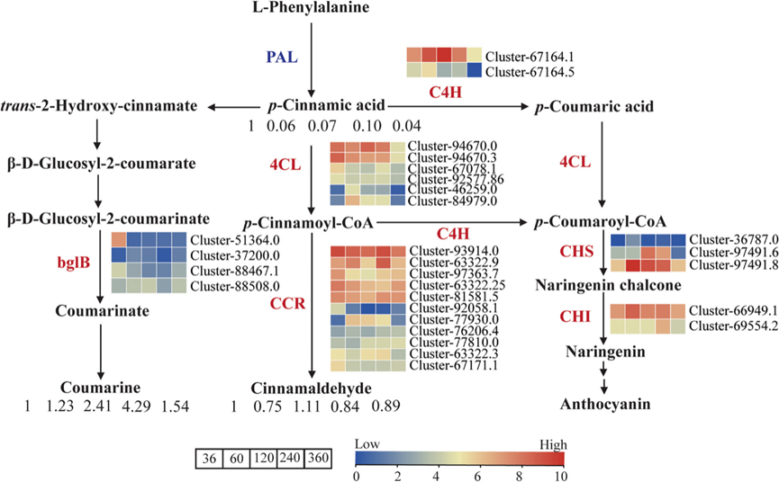 采用顶空-固相微萃取- GC -质谱法(HS-SPME-GC-MS)对肉桂5个不同采收时期样品的挥发性有机物进行了分析,共鉴定出724种差异挥发性有机化合物,其中反式肉桂醛、α-古巴烯、α-杜松烯等28种为主要的香气成分。通过转录组学分析,共鉴定出43,412个参与肉桂挥发性成分生物合成途径的差异表达基因,主要包括一些参与苯丙氨酸(图2)、甲基戊酸(mevalonic acid,MVA)和磷酸甲基赤藓糖醇(methylerythritol phosphate,MEP)合成途径的关键酶基因和转录因子(图3)。