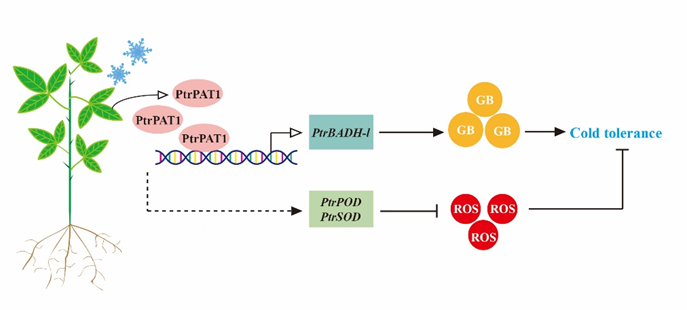 本研究通过转基因实验证实了PtrPAT1调控PtrBADH-l表达和甜菜碱合成积累从而增强枳抗寒性。随后,通过Y1H、EMSA和LUC等分子实验证明了PtrPAT1能特异性结合PtrBADH-l启动子上的TTTCATGT基序并激活其表达。此外,研究表明PtrPAT1还可能通过调控PtrPOD与PtrSOD表达参与冷胁迫下活性氧ROS的清除,进而提高枳的耐寒力。