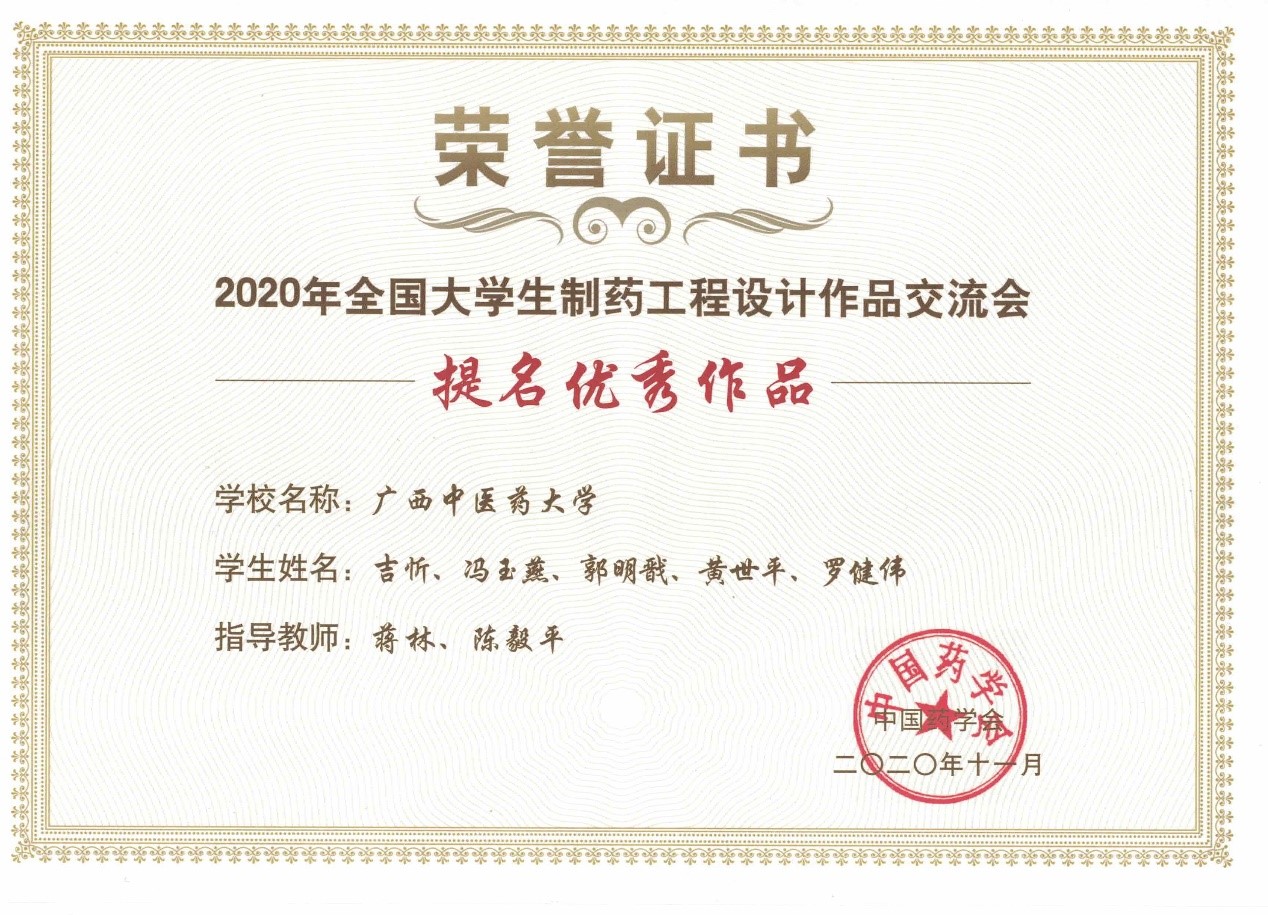 近日,beat365官网学子收到了2020年全国大学生制药工程设计作品交流会获奖证书。beat365官网弘毅队获提名优秀作品证书(相当于全国二等奖)。仲通队获入围作品证书(相当于全国三等奖)。突飞猛进队获提交作品证书(相当于全国比赛的参赛证)。