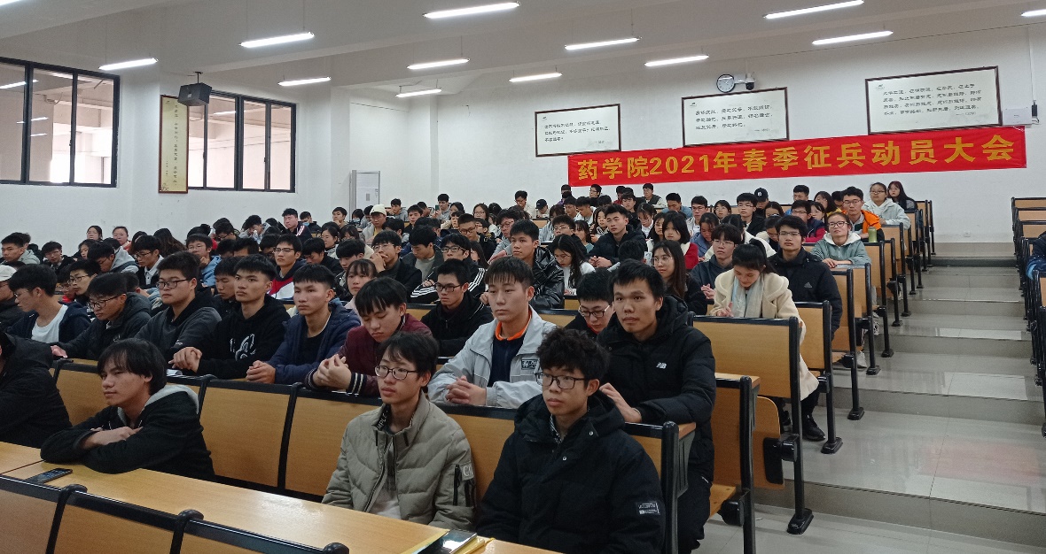 2020年,药学院有4名男生光荣参军入伍,超额完成上级部门下达的征兵任务,荣获学校2020年度征兵工作先进单位荣誉。2021年春季征兵开始后,药学院深入贯彻落实学校征兵工作会议精神,利用周末晚点名、主题班会在5个年级、42个班级深入开展征兵政策宣讲活动,并隆重举行1场征兵动员大会。