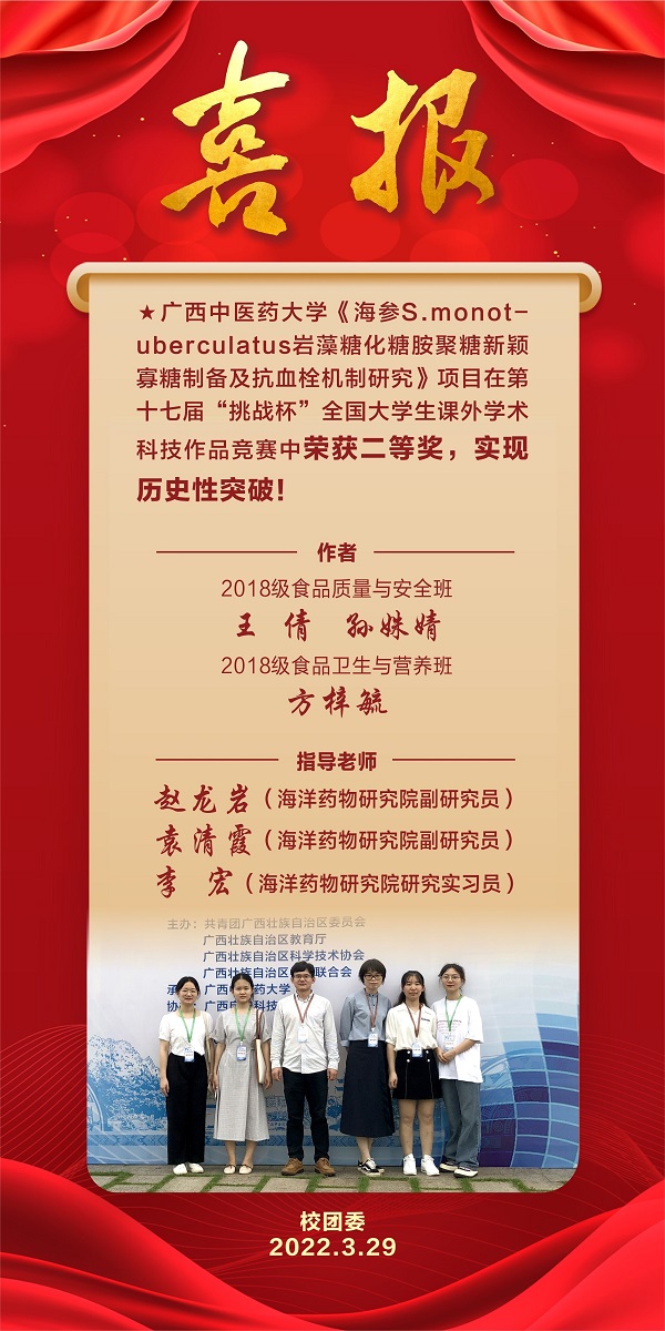 【喜讯】药学院学子荣获第十七届“挑战杯”二等奖,实现历史性突破! 作者:文/吴玉峰 发布时间:2022-03-30 16:54:15 浏览次数: 次 【字体:小 大】 近日,药学院学子王倩、孙姝婧、方梓毓代表beat365官网参加第十七届“挑战杯”全国大学生课外学术科技作品竞赛,凭借《海参S.monot-uberculatus岩藻糖化糖胺聚糖新颖寡糖制备及抗血栓机制研究》项目在大赛中荣获二等奖,实现历史性突破! 分享到: 【打印正文】